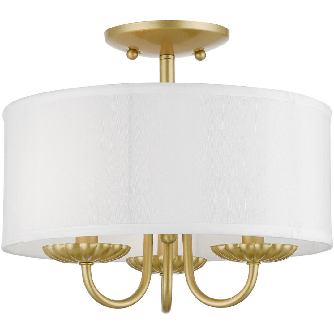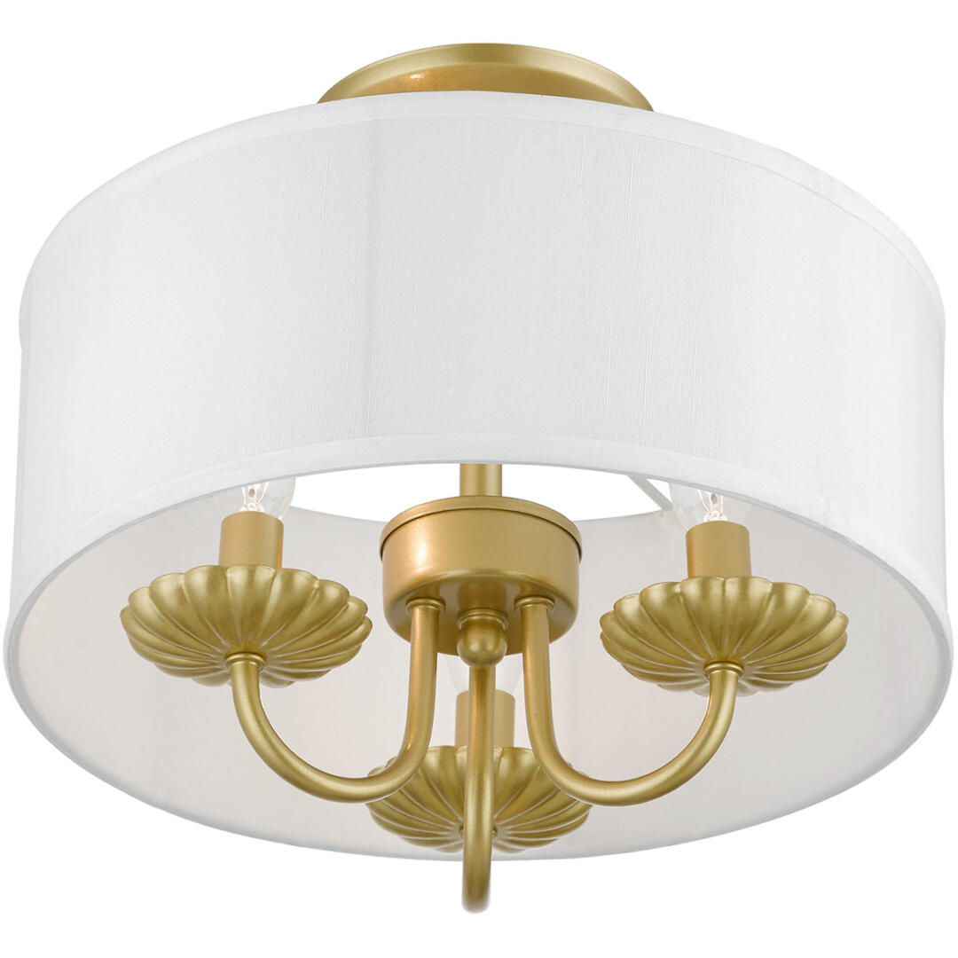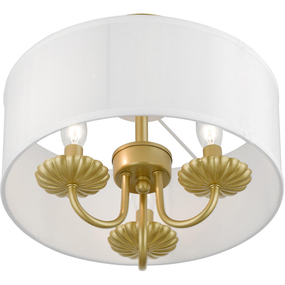 The three-light Brookdale semi-flush combines floral details and casual elements to create an updated look. The hand-crafted off-white fabric hardback drum shade is set off by an inner silky white fabric that combines with chandelier-like soft gold finish sweeping arms which creates a versatile effect. Perfect fit for the living room, dining room, kitchen or bedroom.