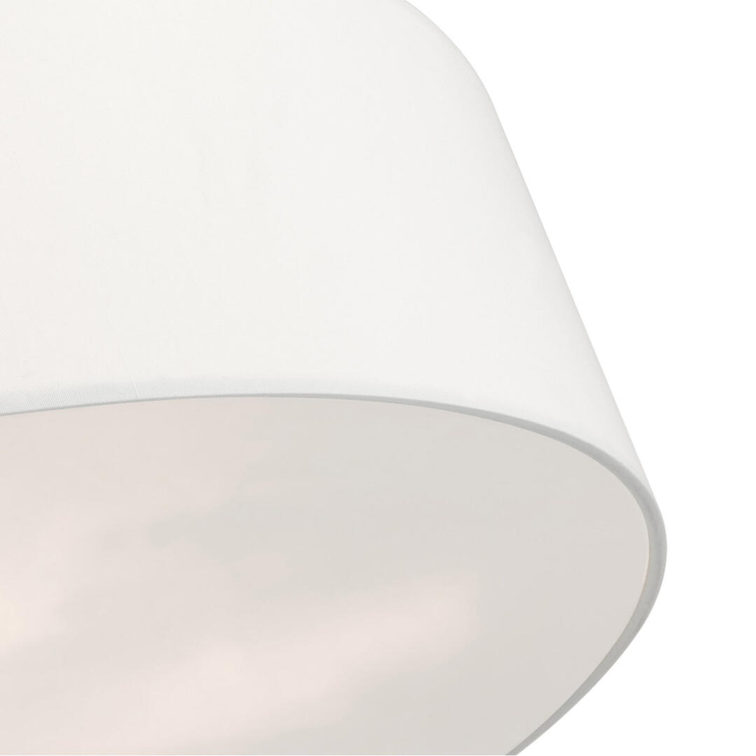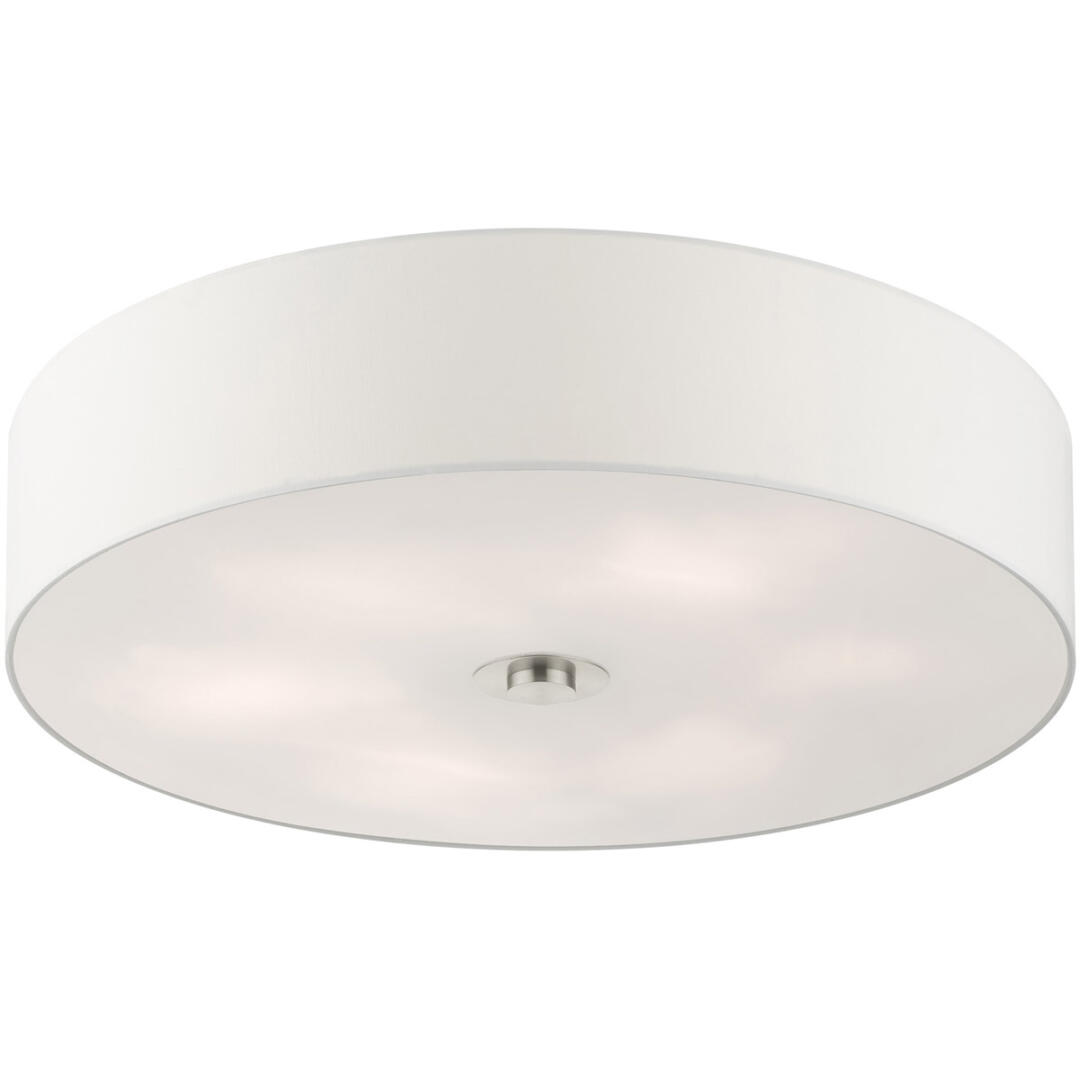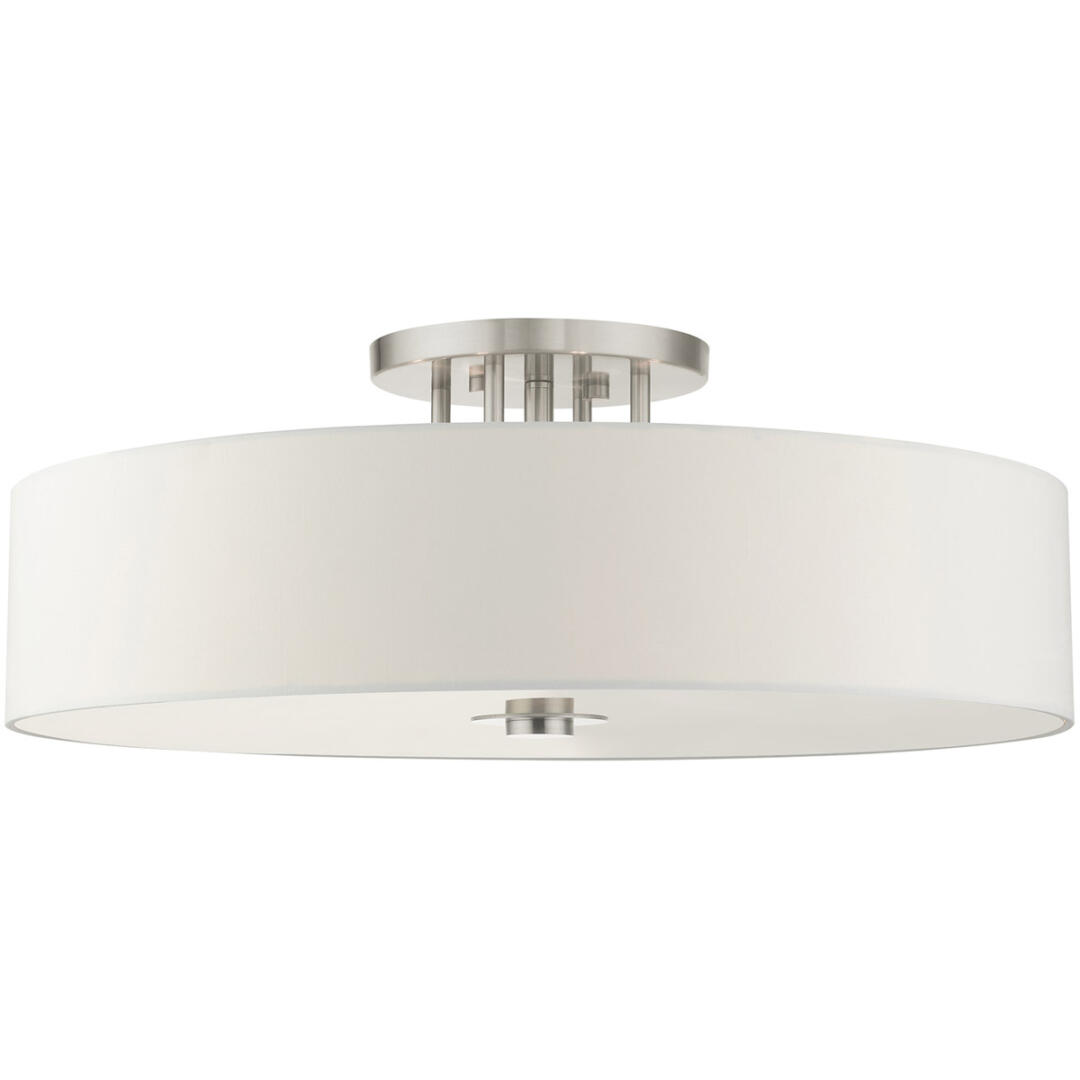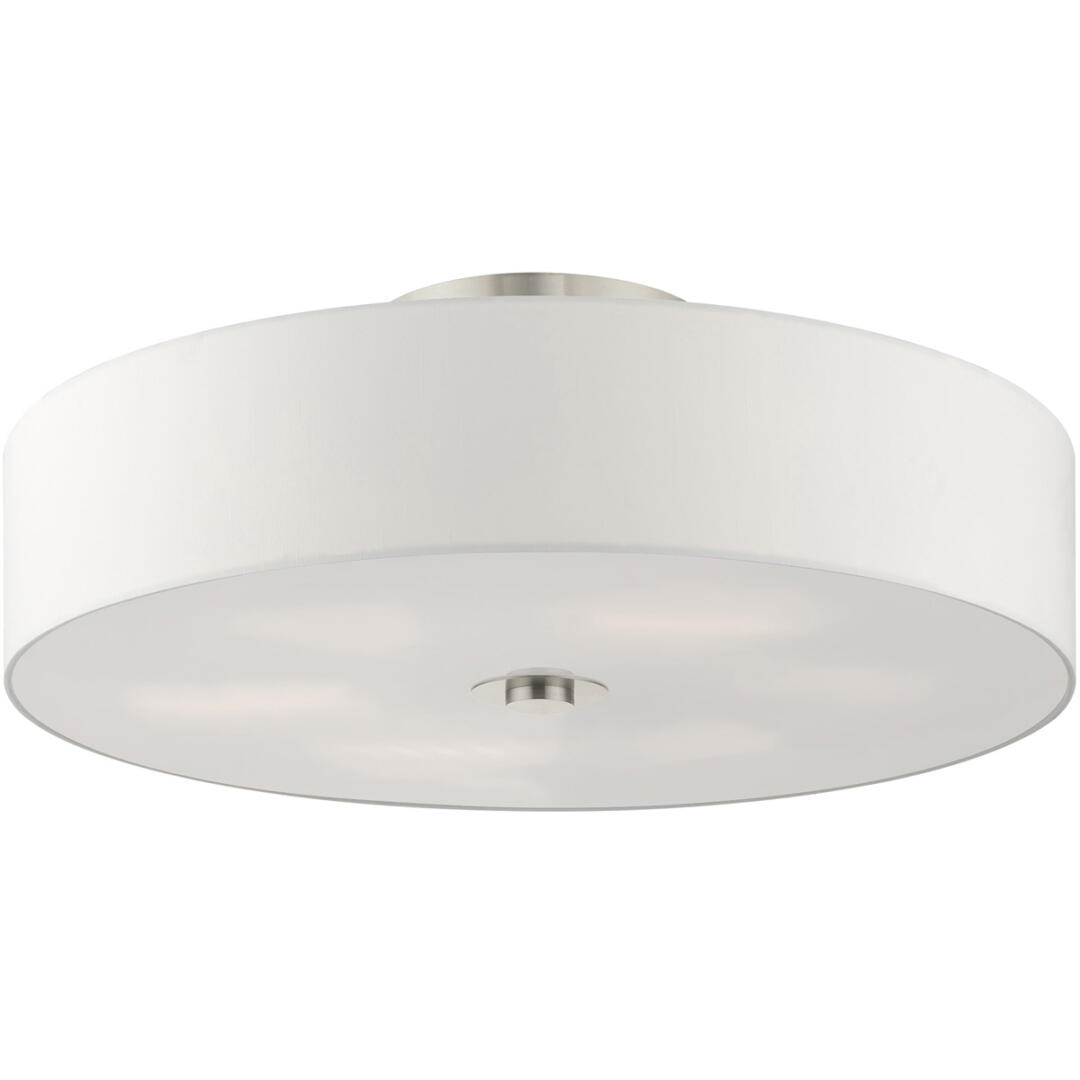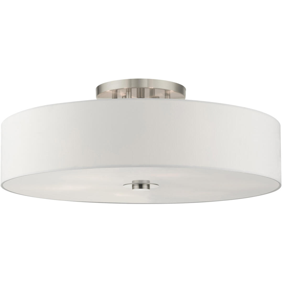 The Meridian collection has a clean, crisp look and contemporary appeal. The hand-crafted off-white fabric hardback shade offers a diffused warm light. This extra-large six-light drum shade adds character to this handsomely styled semi flush mount. Will adapt well in the living room, dining room, front entrance and bedroom tastefully elevating your style. This sleek design is shown in a brushed nickel finish.
