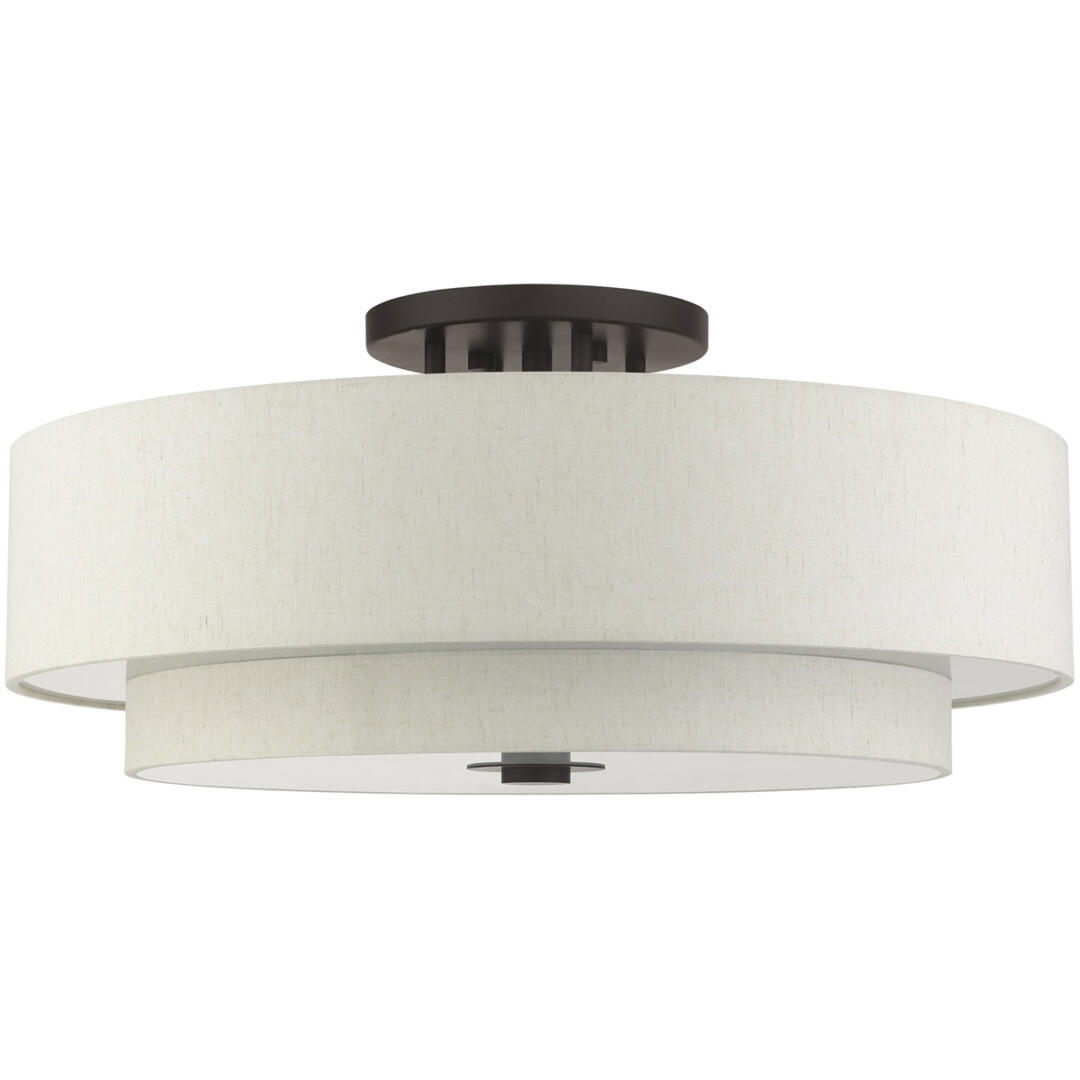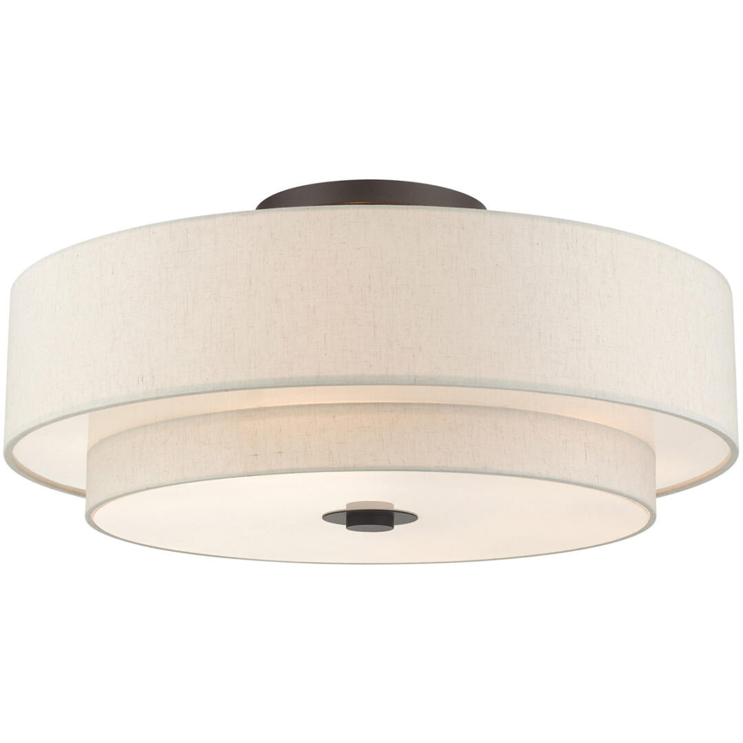 The Monroe collection has a clean, crisp look and contemporary appeal. The hand-crafted oatmeal colored fabric hardback shades offer a diffused warm light. This extra-large six-light double drum shade adds character to this handsomely styled semi flush mount. Will adapt well in the living room, dining room, the entrance or in the bedroom tastefully elevating your style. This sleek design is shown in an English bronze finish.