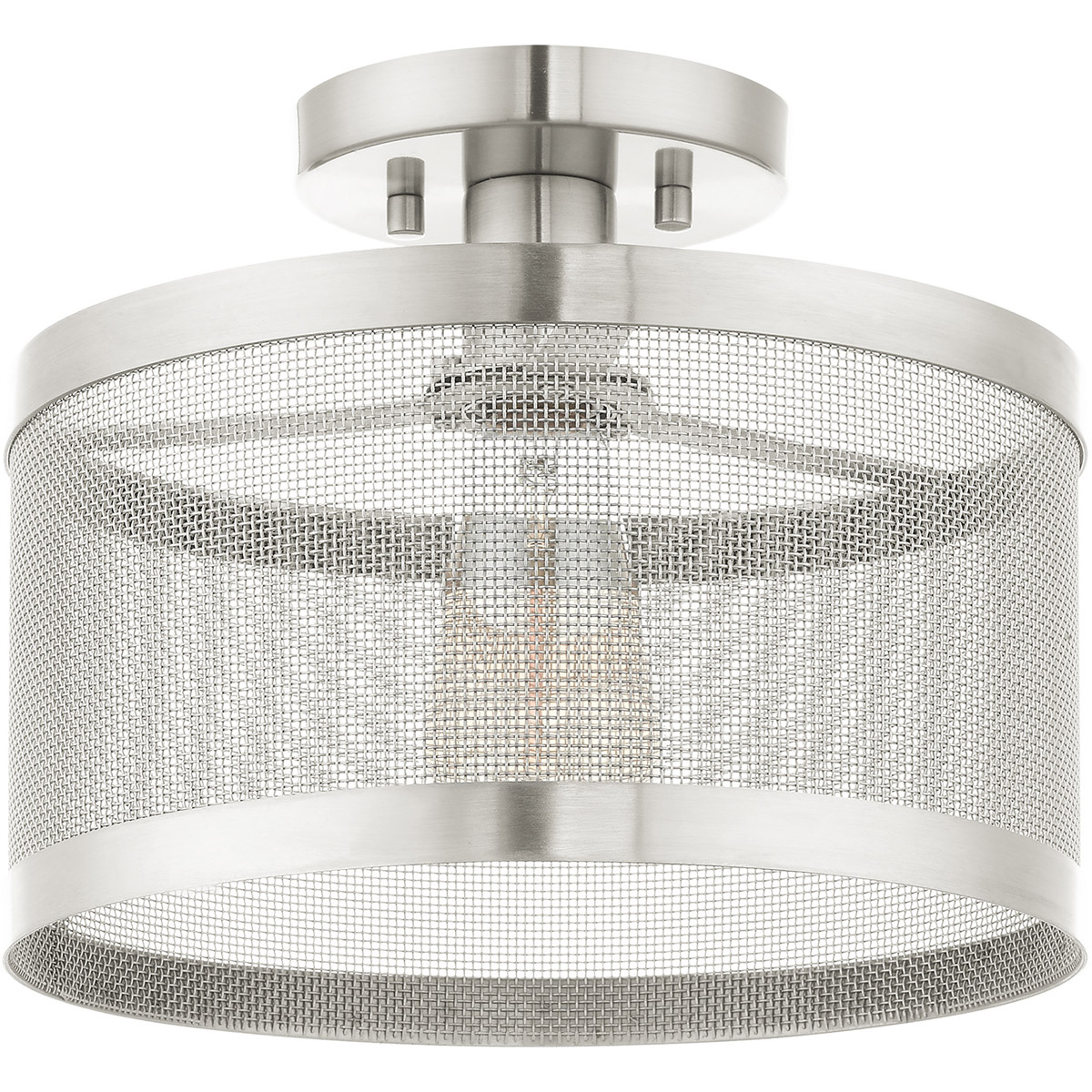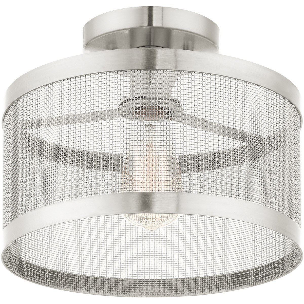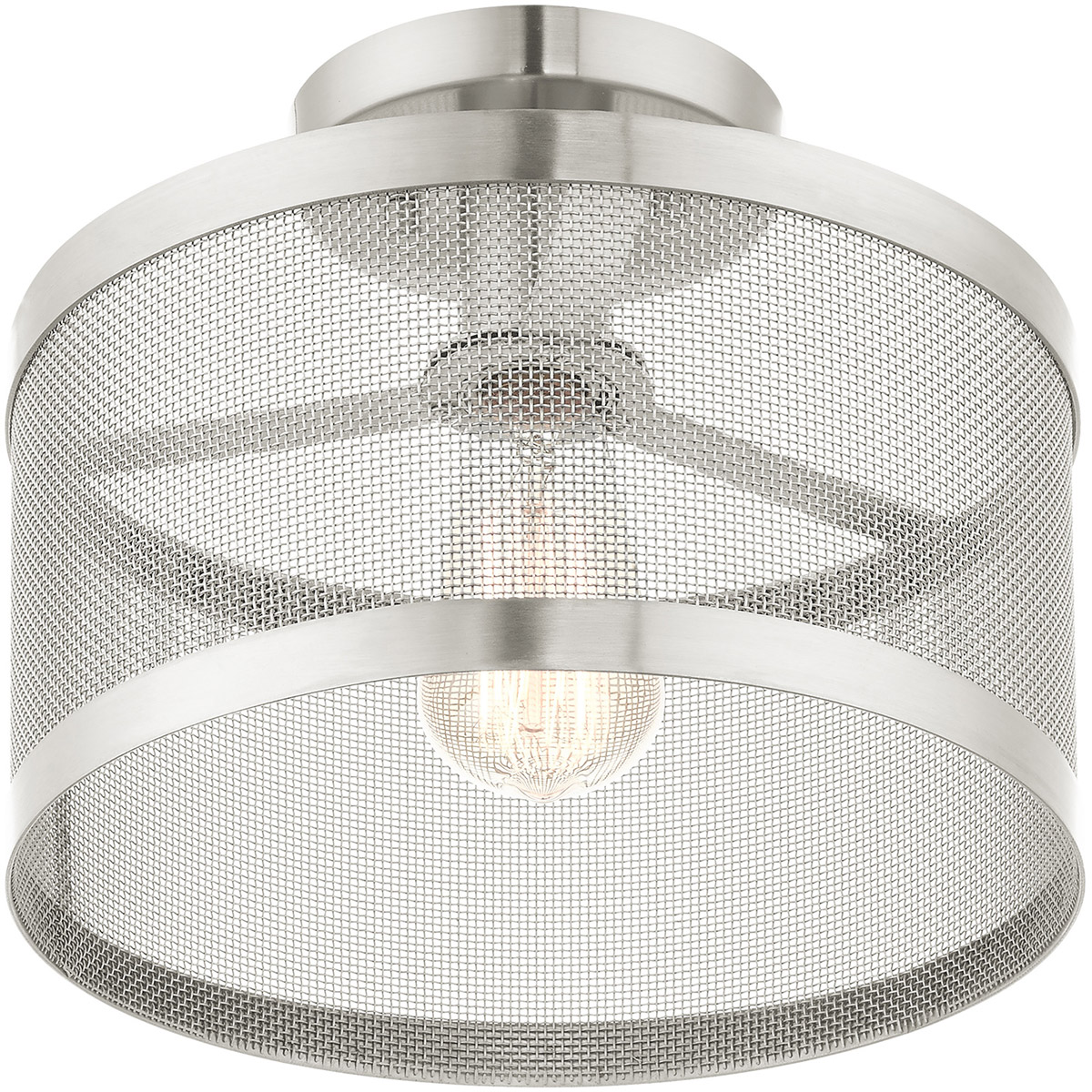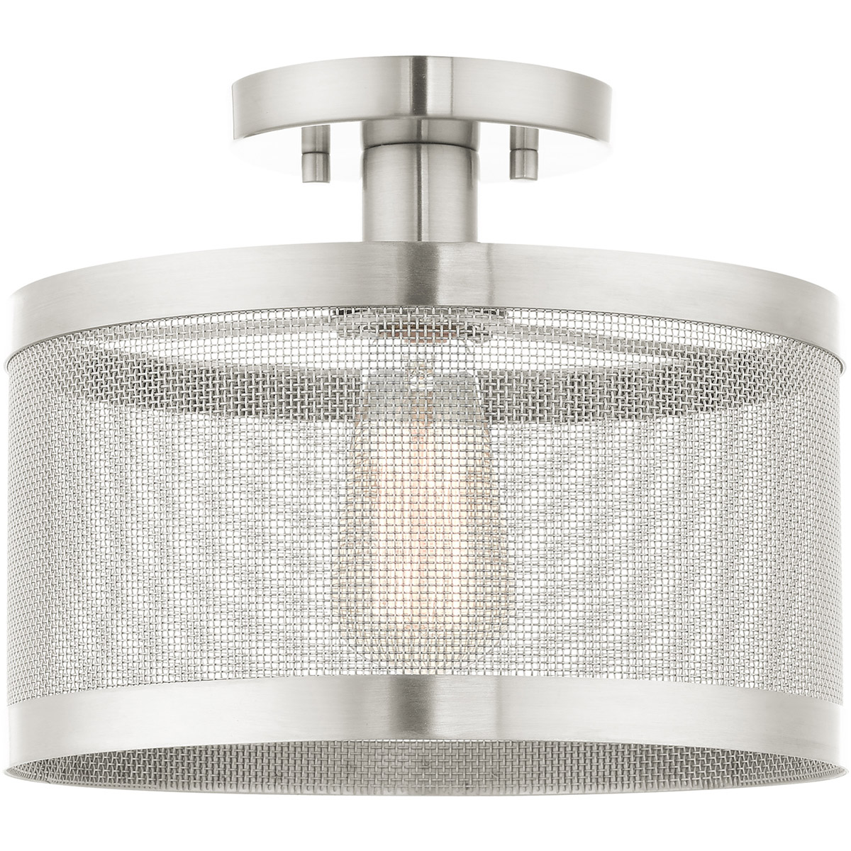 The Industro collection has a clean, crisp look and contemporary appeal. This one-light petite semi-flush has a brushed nickel finish and a sleek stainless steel mesh shade. Will adapt well in the hallway, bathroom, kitchen and a small bedroom tastefully elevating your style.