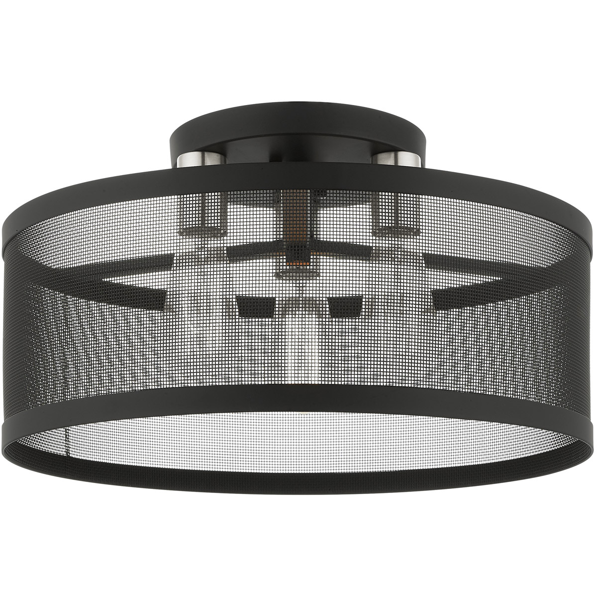 The Industro collection has a clean, crisp look and contemporary appeal. This three-light large semi-flush has a black finish with brushed nickel finish accents and a sleek stainless steel mesh shade. Will adapt well in the hallway, bathroom, kitchen and bedroom tastefully elevating your style.