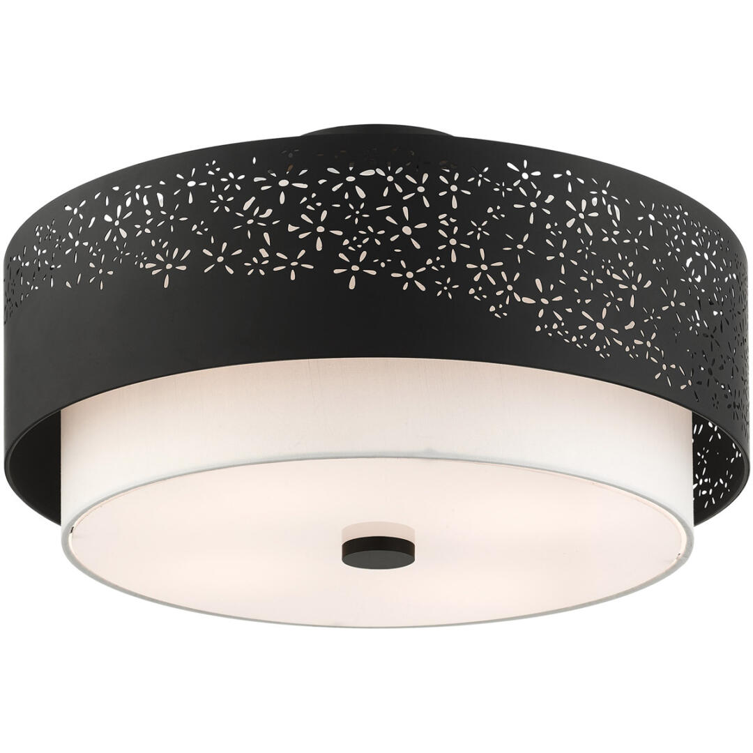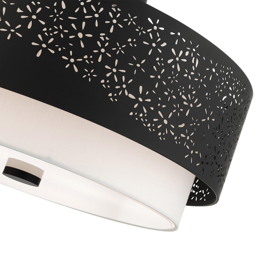 The Noria collection combines an intricate organic laser cut black finish steel frame surrounds an off-white fabric shade creating a casual warm light with a touch of nature vibe. This four-light semi flush mount will have a commanding presence in many areas of your home. You can place it in the living room, over the dining table, kitchen or bedroom.