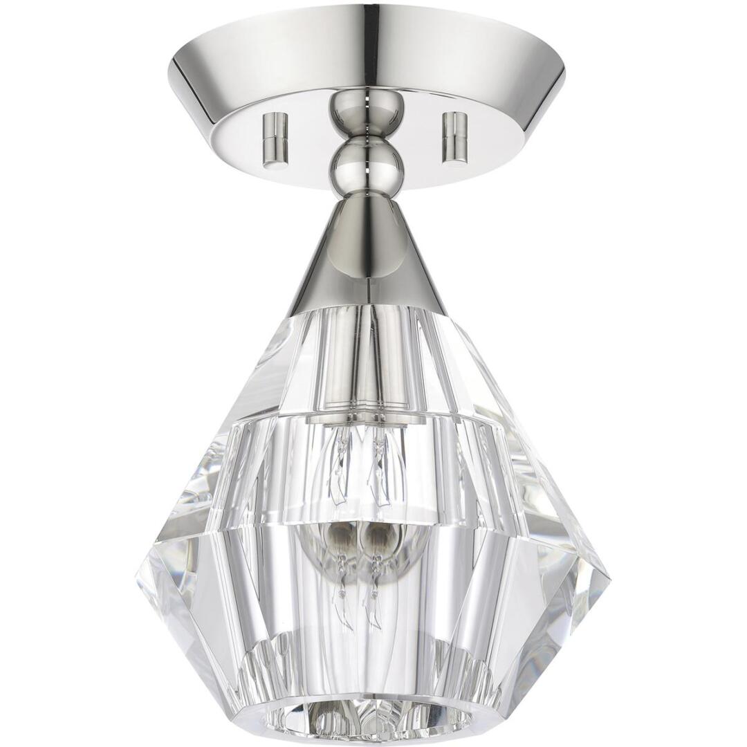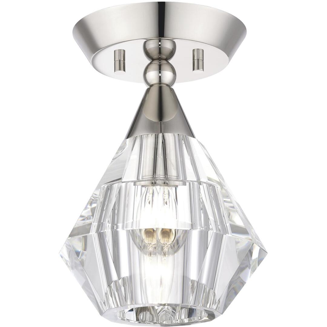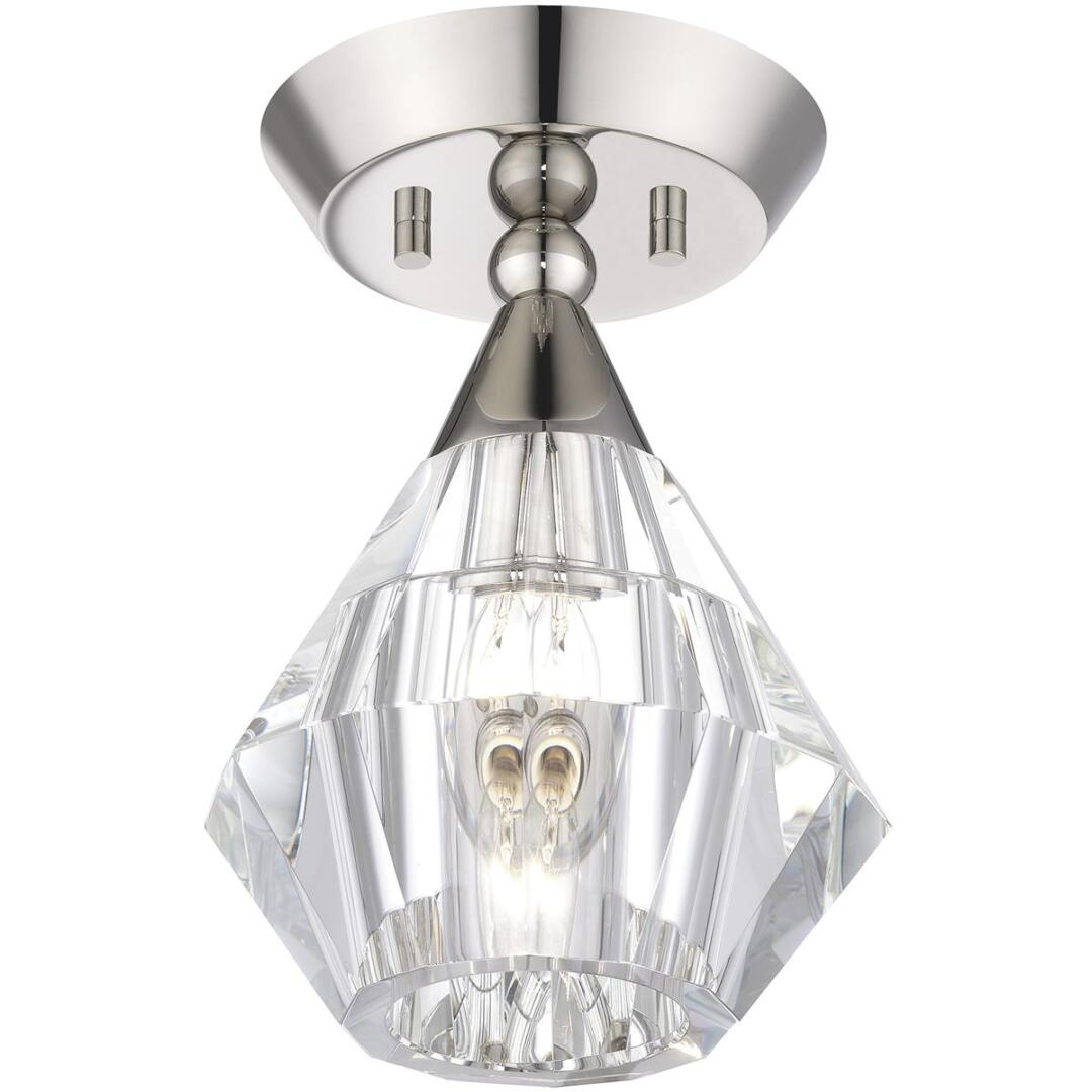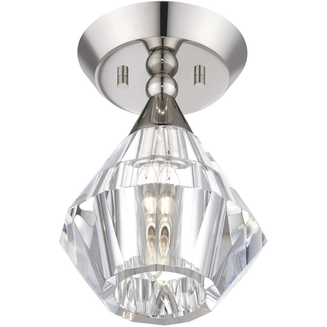 Clear faceted crystal makes an elegant appearance in this polished nickel semi-flush light. The Brussels is small and attractive, and will make a dazzling impression.