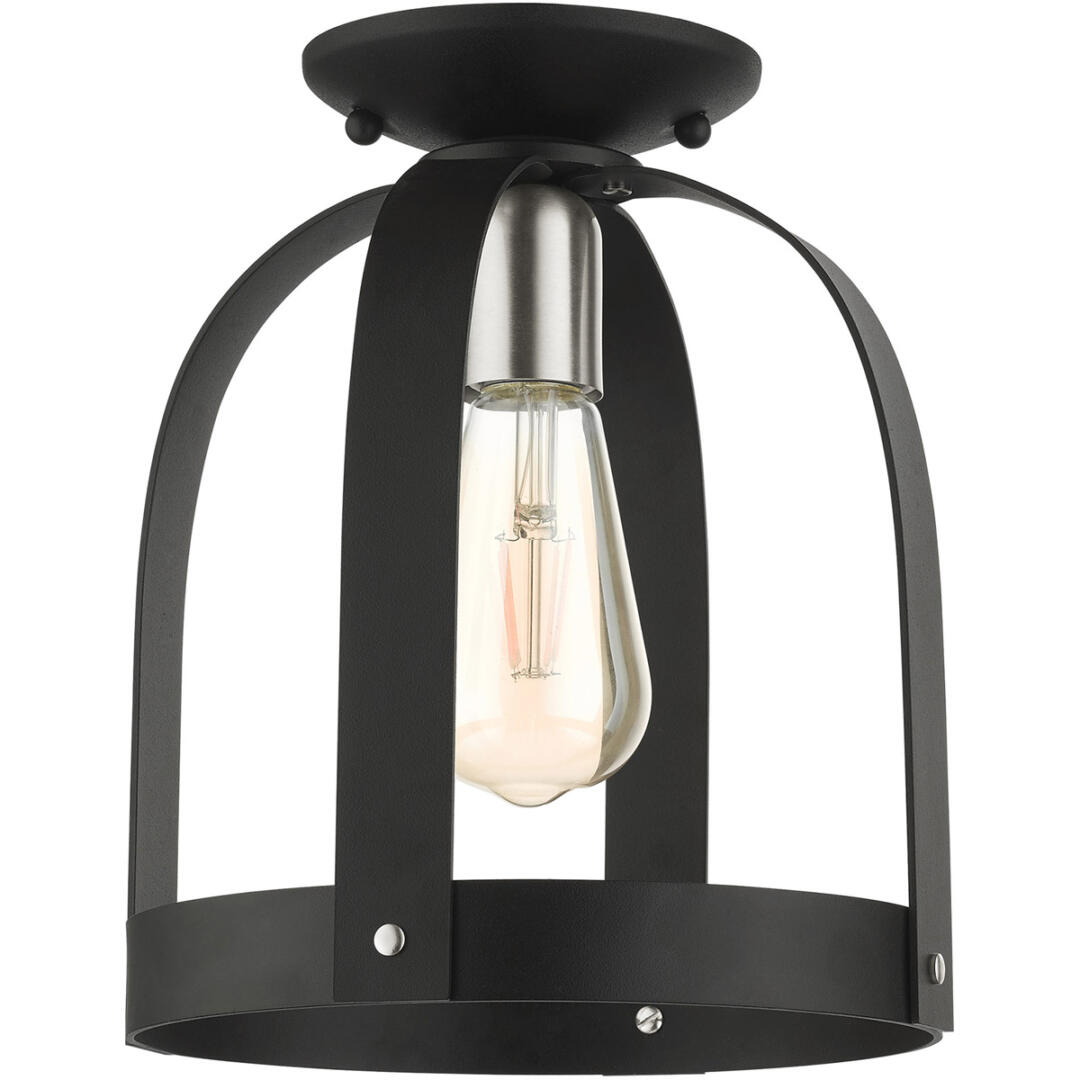 The Stoneridge collection hints at a casual rustic vibe. It features beautifully rounded steel straps held together by rivets. The cluster of lights are reminiscent of the sputnik design from the 50s and 60s mid-century modern era. This single light semi flush is shown in a textured black finish with brushed nickel accents. It will be a great feature in your modern loft or cabin as well as any transitional style interior.