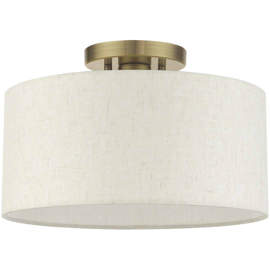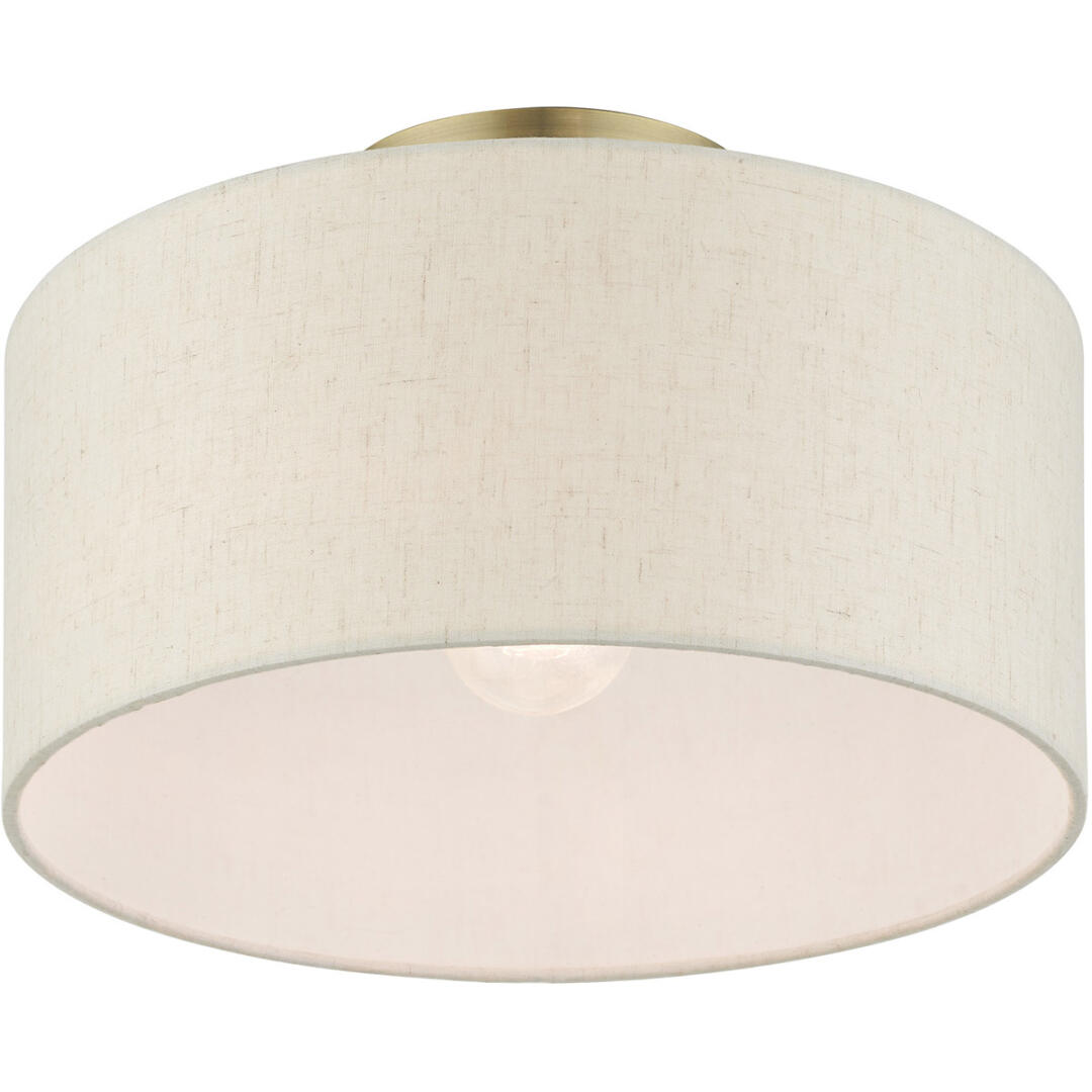 Add a touch of stylish sophistication with the Blossom series, a graceful transitional collection. Look no further if you crave to add warmth and richness to any formal or casual interior. The elegant handcrafted hardback oatmeal colored shade will create a timeless feel to the hallway, bathroom, kitchen or a bedroom. This meticulously crafted single-light semi flush is shown in an antique brass finish.
