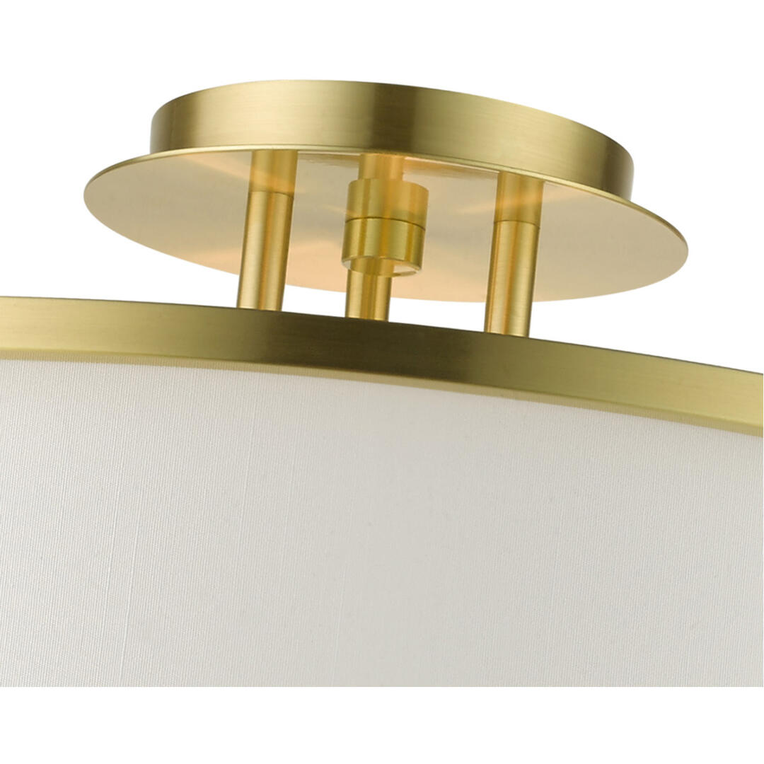 This large satin brass finish four-light semi flush fixture from the Wesley Collection features an off-white hardback fabric shade. Practical illumination, timeless charm and versatility make this ceiling mount the right choice for any room of your house. With its easy installation and low upkeep requirements, this charming piece will not disappoint.