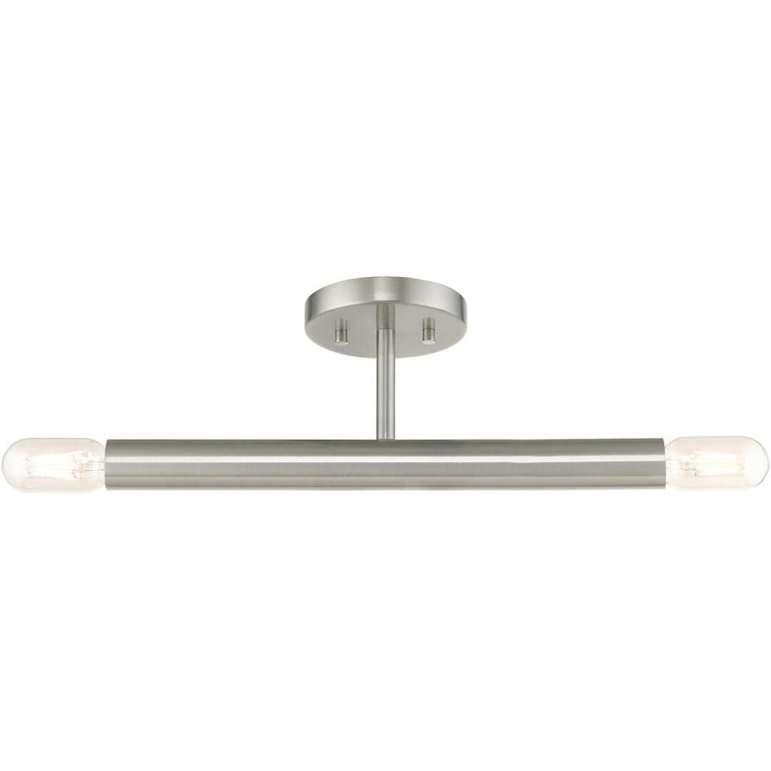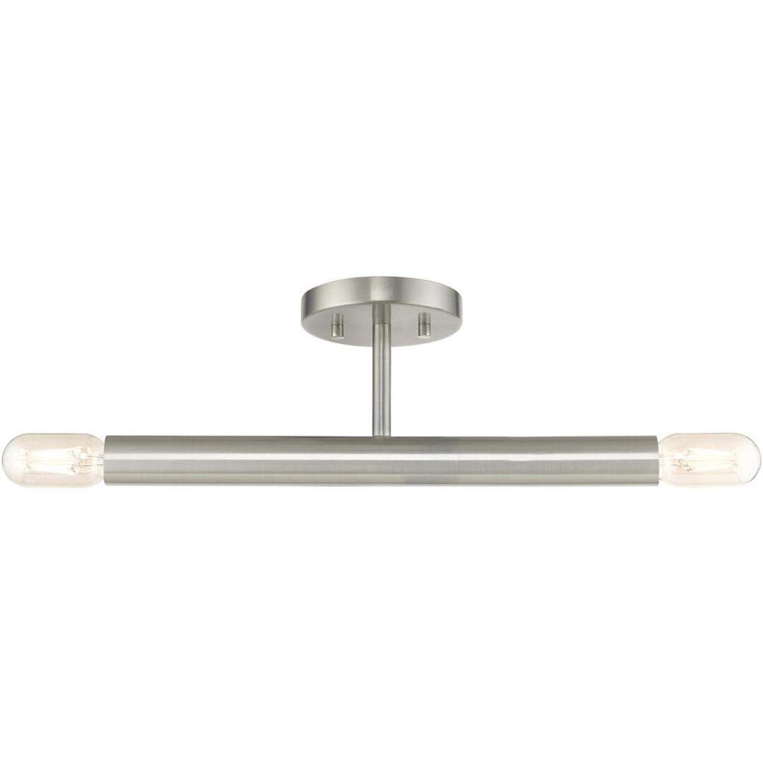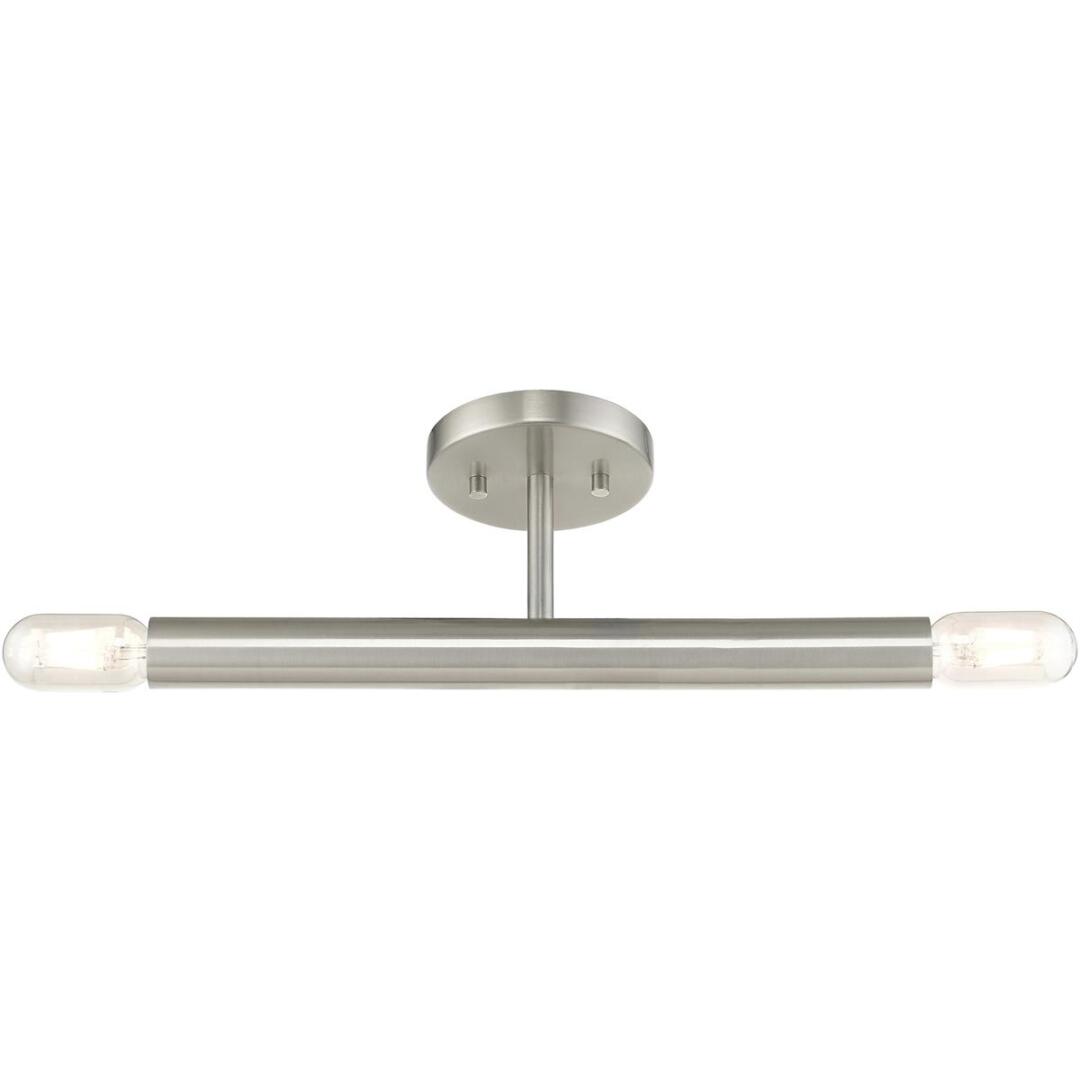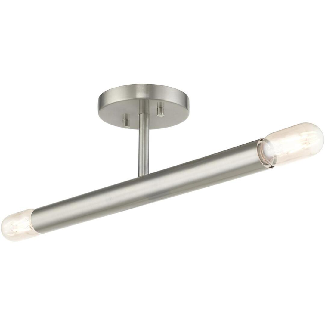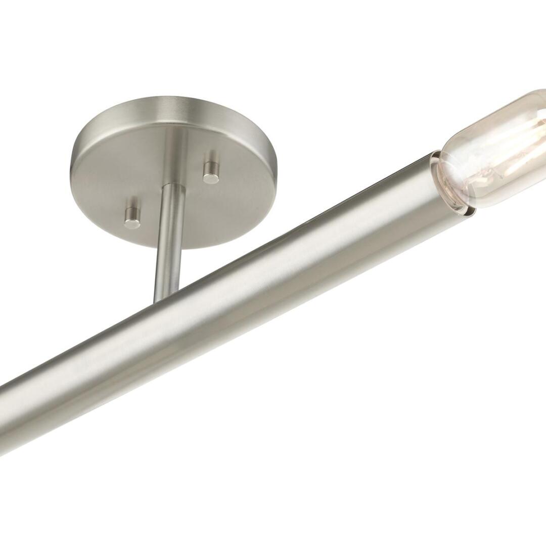 Exposed bulb sockets are fixed over the brushed nickel finish to create an eclectic look perfect for mid century modern or transitional spaces wanting an industrial touch.