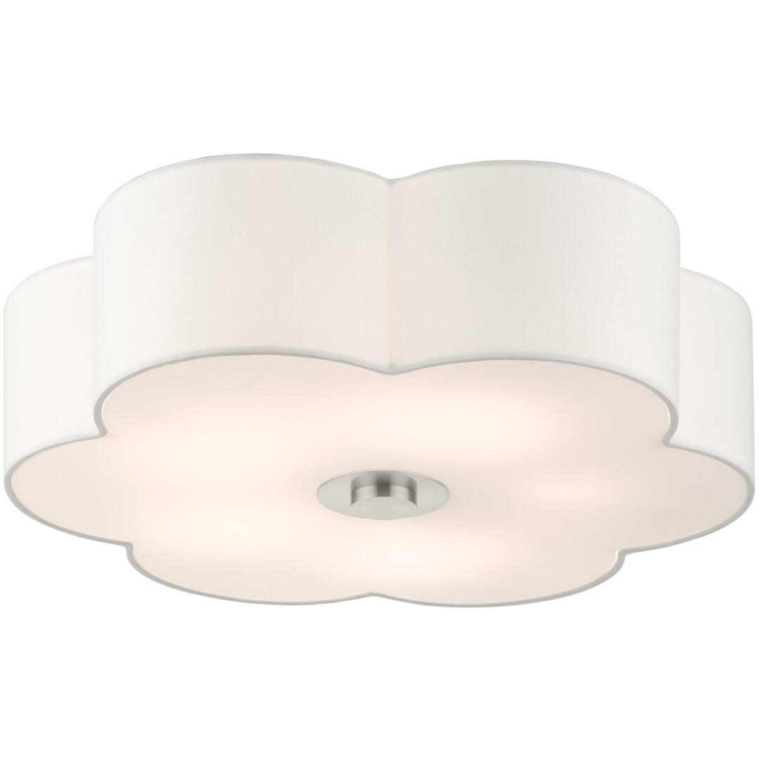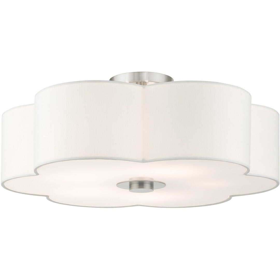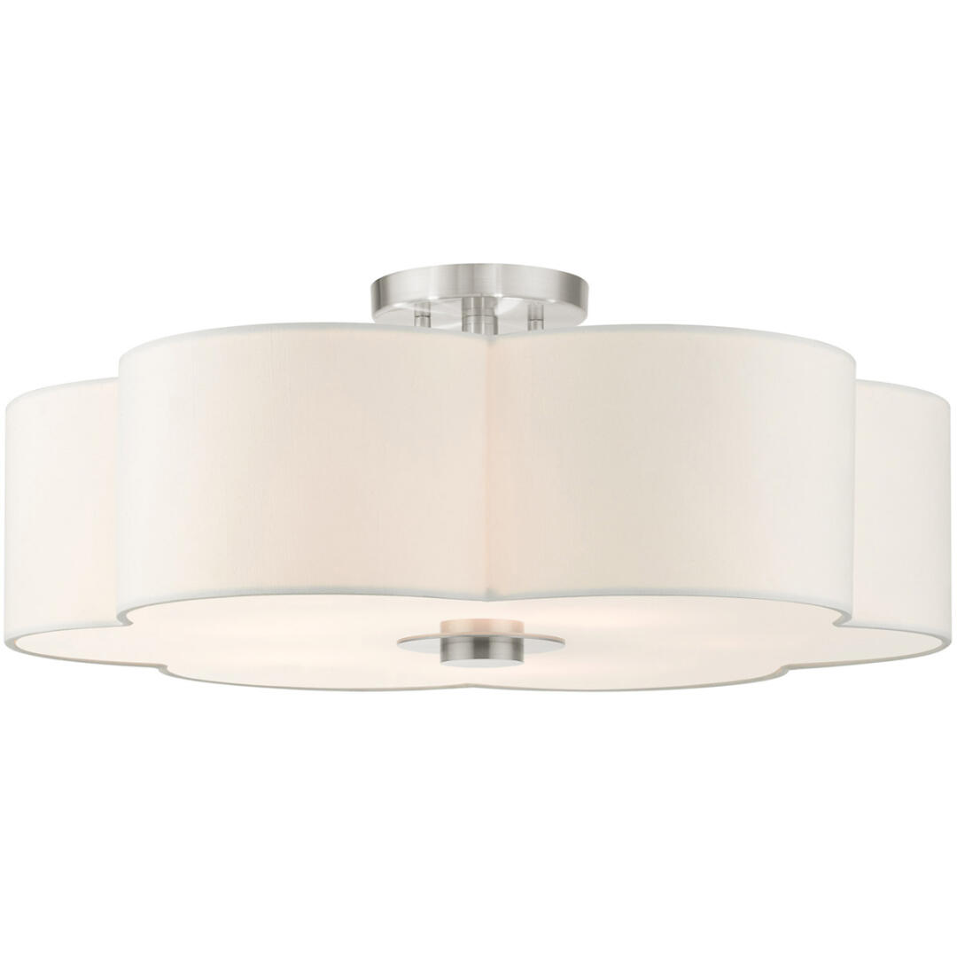 The Chelsea line exudes French country chic vibe. This extra-large five-light semi flush features a beautiful hand crafted scalloped shaped, off-white hardback shade and comes in a brushed nickel finish. Perfect pick for a traditional, transitional or contemporary style. Enjoy this design in the living room, bedroom or dining room.