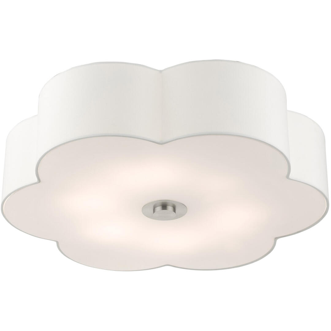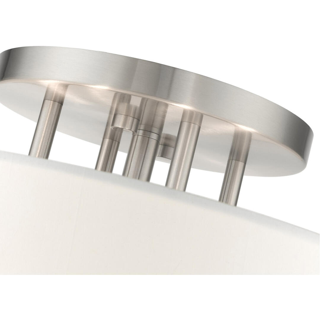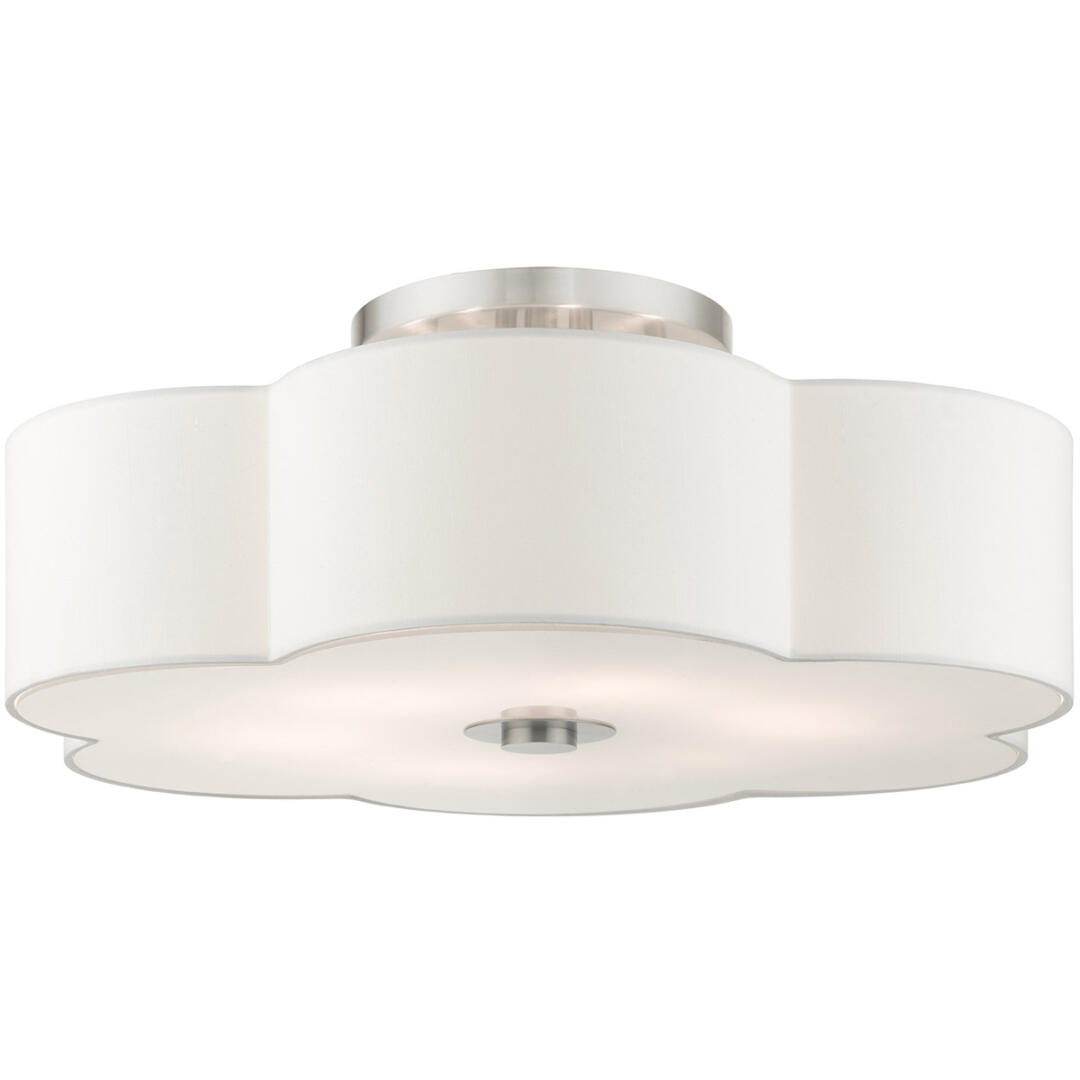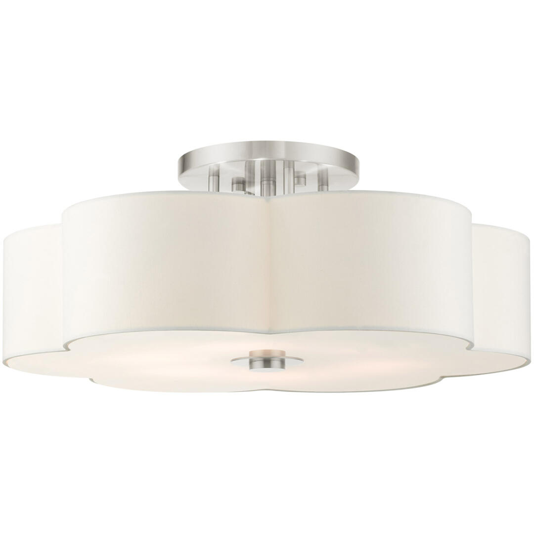 The Chelsea line exudes French country chic vibe. This extra-large six-light semi flush features a beautiful hand crafted scalloped shaped, off-white hardback shade and comes in a brushed nickel finish. Perfect pick for a traditional, transitional or contemporary style. Enjoy this design in the living room, bedroom or dining room.