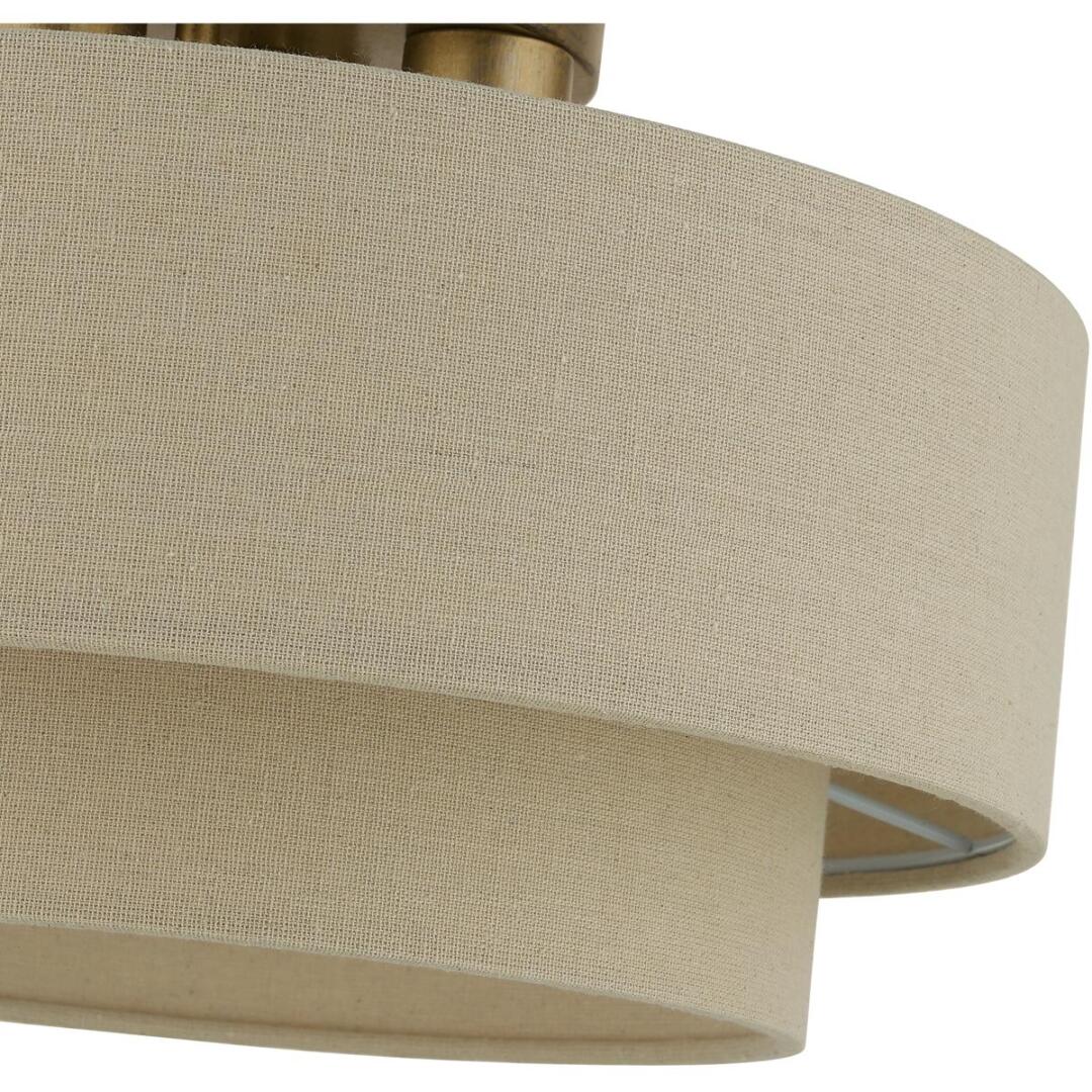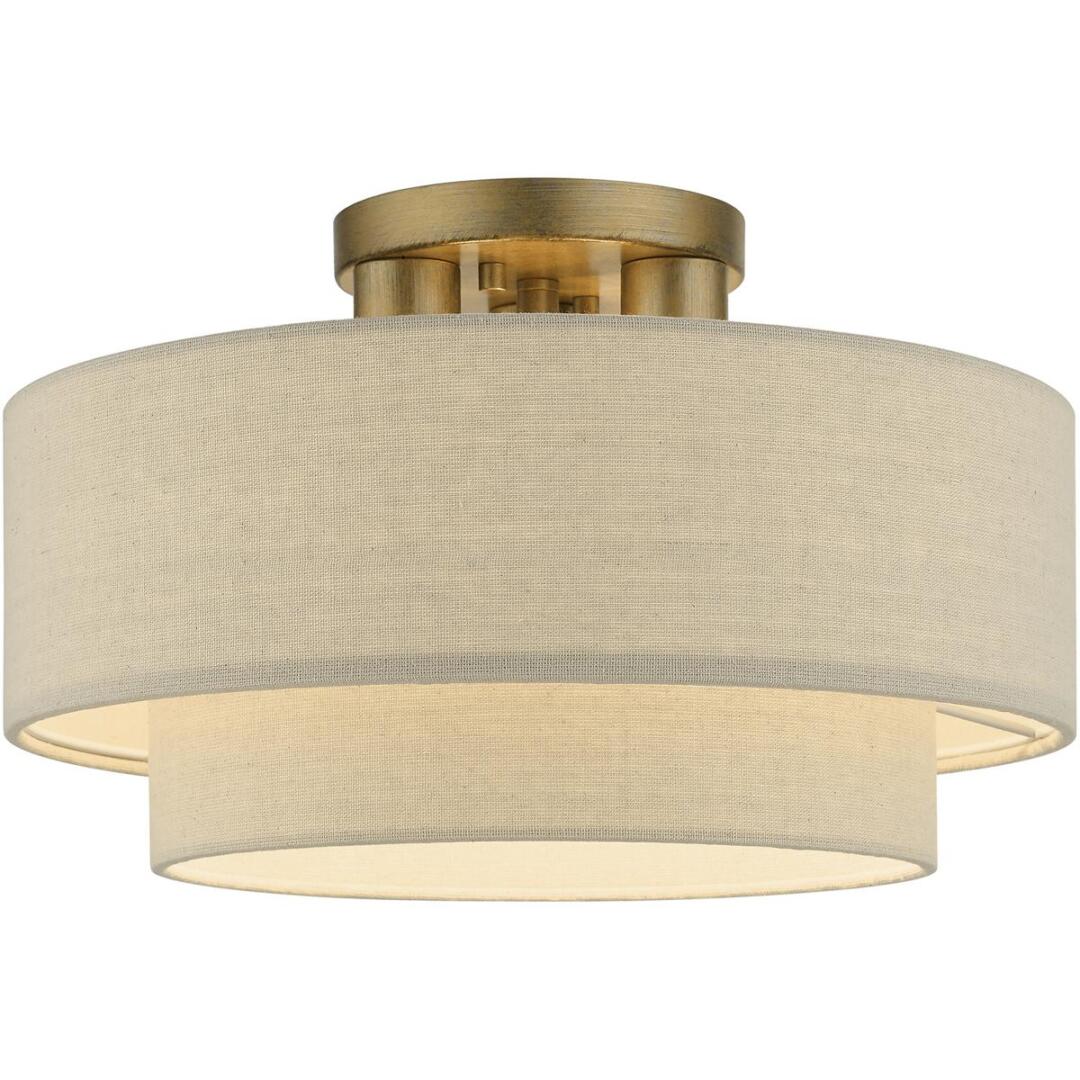 The Gladstone semi-flush is both modern and versatile. The hand-crafted ash gray colored fabric hardback shade sets a pleasant mood. The three-light double drum shade adds character to this handsome style. This sleek design is shown in an antique gold leaf finish.