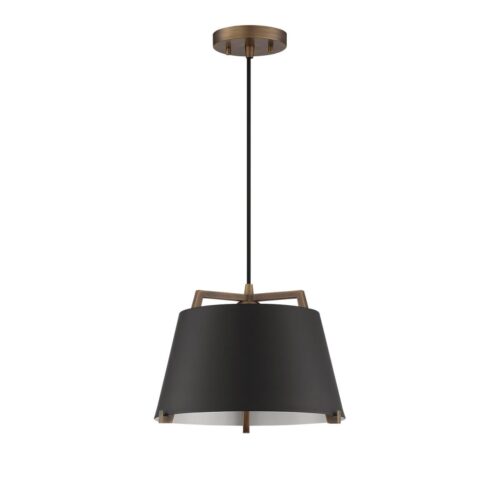Introducing the SKY 1-Light Black & Brass Pendant from the Kendall Lighting SKY Series, a stunning blend of modern elegance and industrial charm. This pendant light features a sleek metal shade with a striking black and brass finish, making it a perfect addition to any contemporary or traditional space. With a shade width of 12.4 inches and a height of 9 inches, it offers an ideal scale for dining areas, kitchens, or living rooms. The pendant is equipped with 10 feet of durable 3-core black braided wire, allowing for versatile installation options to suit your design needs. Designed to accommodate a standard A type E-26 medium base bulb with a maximum wattage of 100, this fixture not only illuminates your space beautifully but also brings a touch of sophistication to your decor.