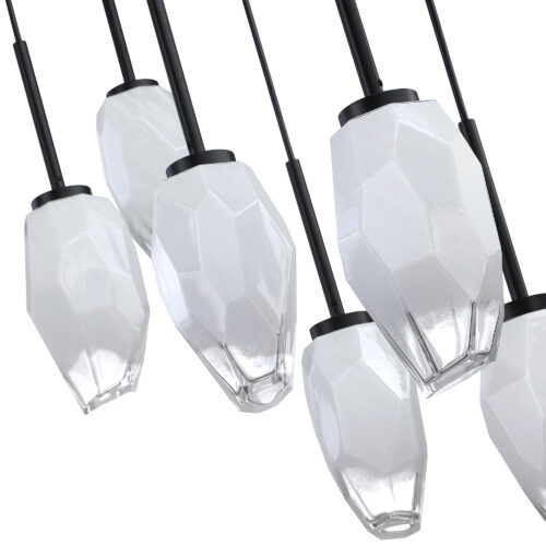 Introducing the SOREN 5-Light Pendant Pan from Kendall Lighting, a stunning addition to any modern decor. This elegant pendant light features a sleek black finish and is beautifully complemented by clear tipped sculpted ice glass shades. Designed for versatility, the SOREN series is LED compatible, allowing you to choose energy-efficient lighting solutions. With a diameter of 4.3 inches and a height of 8 inches, this fixture provides ample illumination while making a bold statement in your space. The overall width measures 17.7 inches, and it offers an adjustable height ranging from a maximum of 127 inches to a minimum of 15.4 inches, making it perfect for dining areas, living rooms, or entryways.