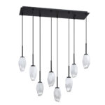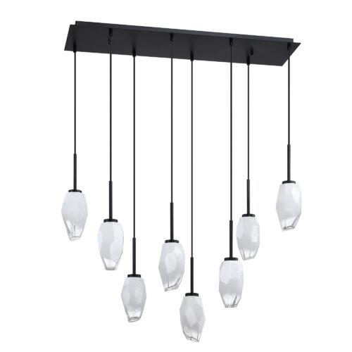 Illuminate your space with the SOREN 8-Light Rectangular Pan from the Kendall Lighting SOREN Series, a stunning focal point that effortlessly combines modern design with elegant functionality. Featuring a sleek black finish and captivating Clear Tipped Sculpted Ice Glass shades, this chandelier not only enhances your decor but also provides ambient lighting that sets the perfect mood for any occasion. With a generous width of 42 inches and a height adjustable from 88 inches to a minimum of 15.4 inches, this fixture is ideal for various ceiling heights, making it a versatile addition to your dining room, living room, or entryway.
