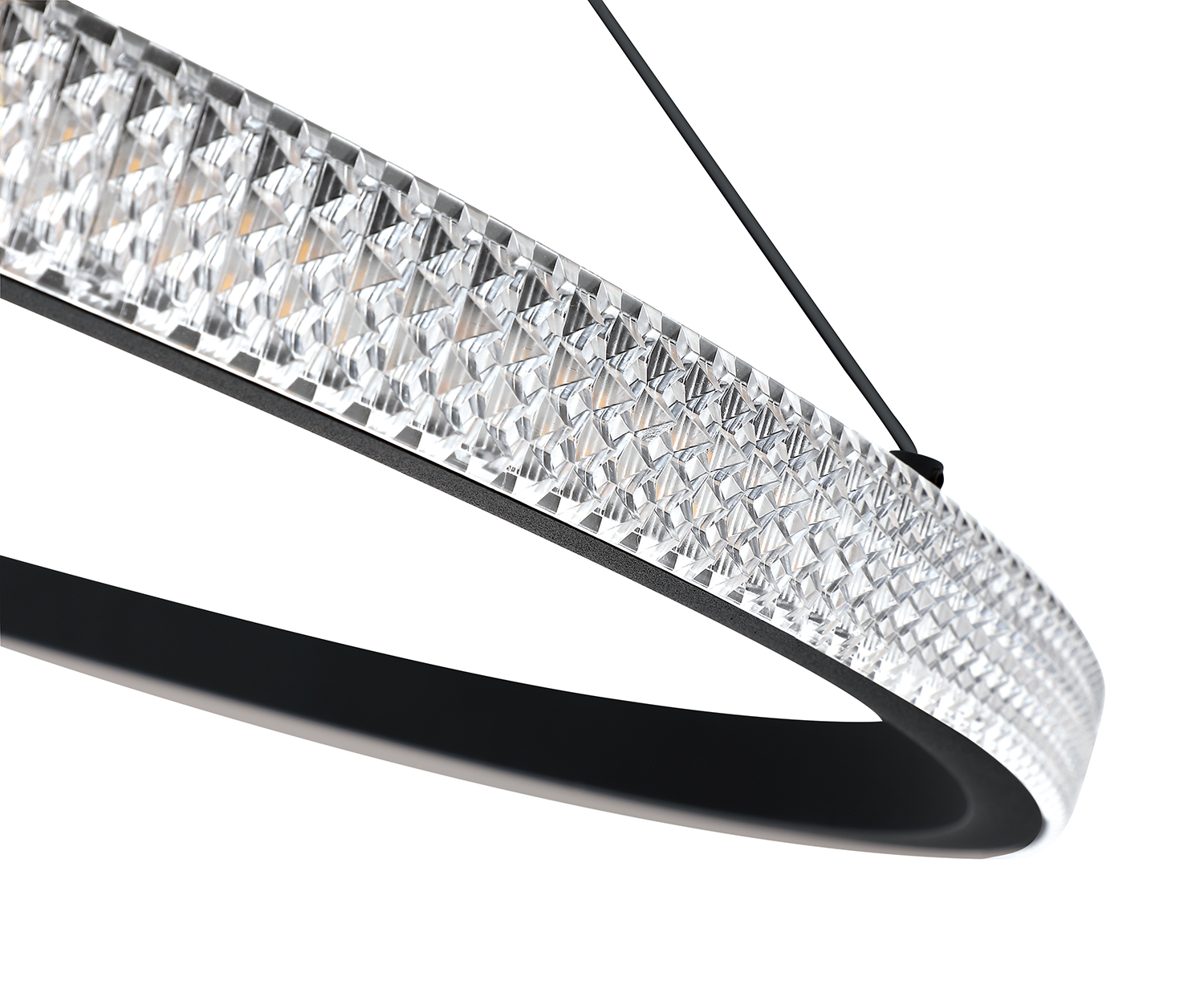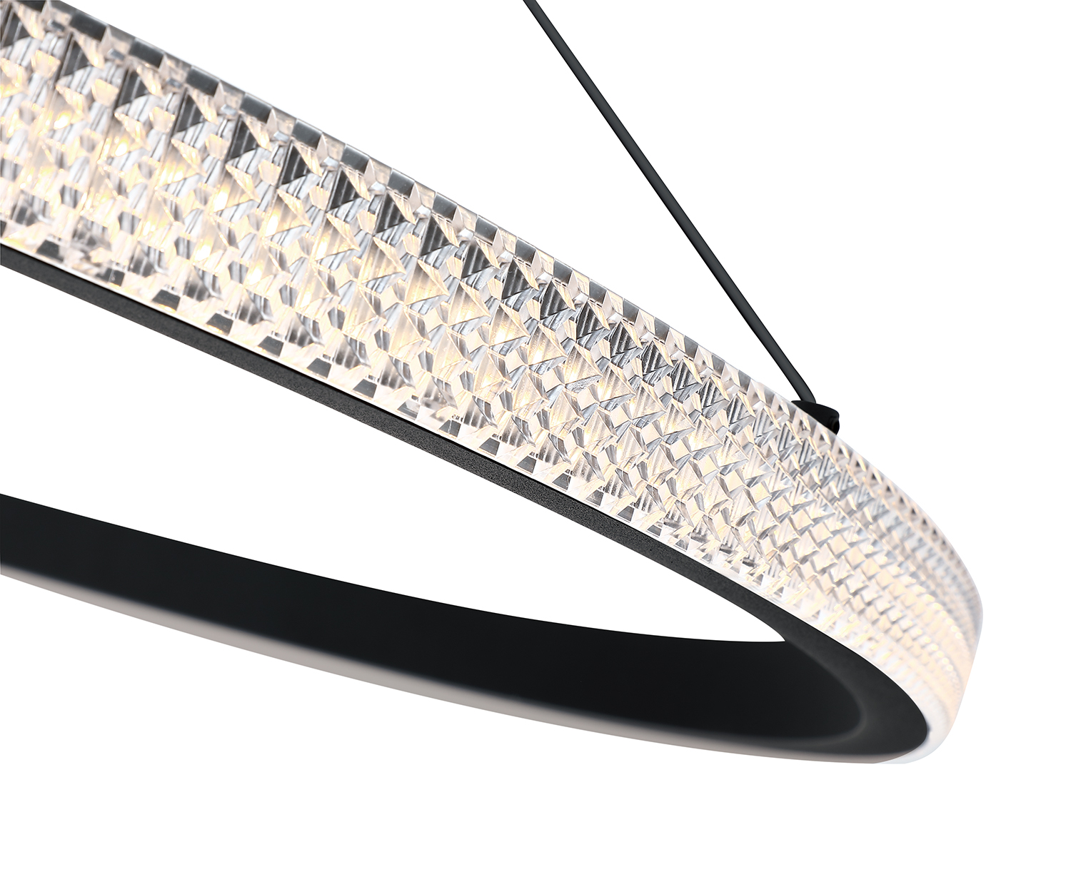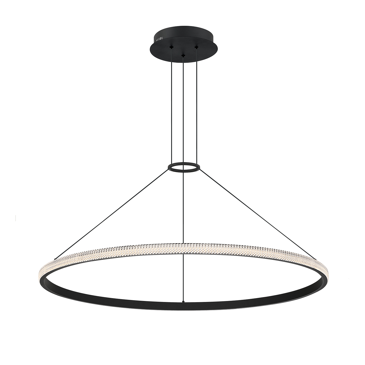 Introducing the PRADO Single Tier LED Pendant from Kendall Lighting, a stunning addition to modern decor that merges elegance with functionality. Finished in a sleek black, this pendant light features an exquisite clear Crystaline Acrylic band that beautifully diffuses light, creating a warm and inviting ambiance. With a powerful integrated LED bulb rated at 55 watts, it delivers a bright output of 4235 lumens while maintaining an inviting color temperature of 3000K and a high color rendering index (CRI) of over 80, making it the perfect choice for illuminating living spaces, dining areas, or even commercial settings. The fixture is expertly crafted from durable iron and aluminum, ensuring both longevity and style.