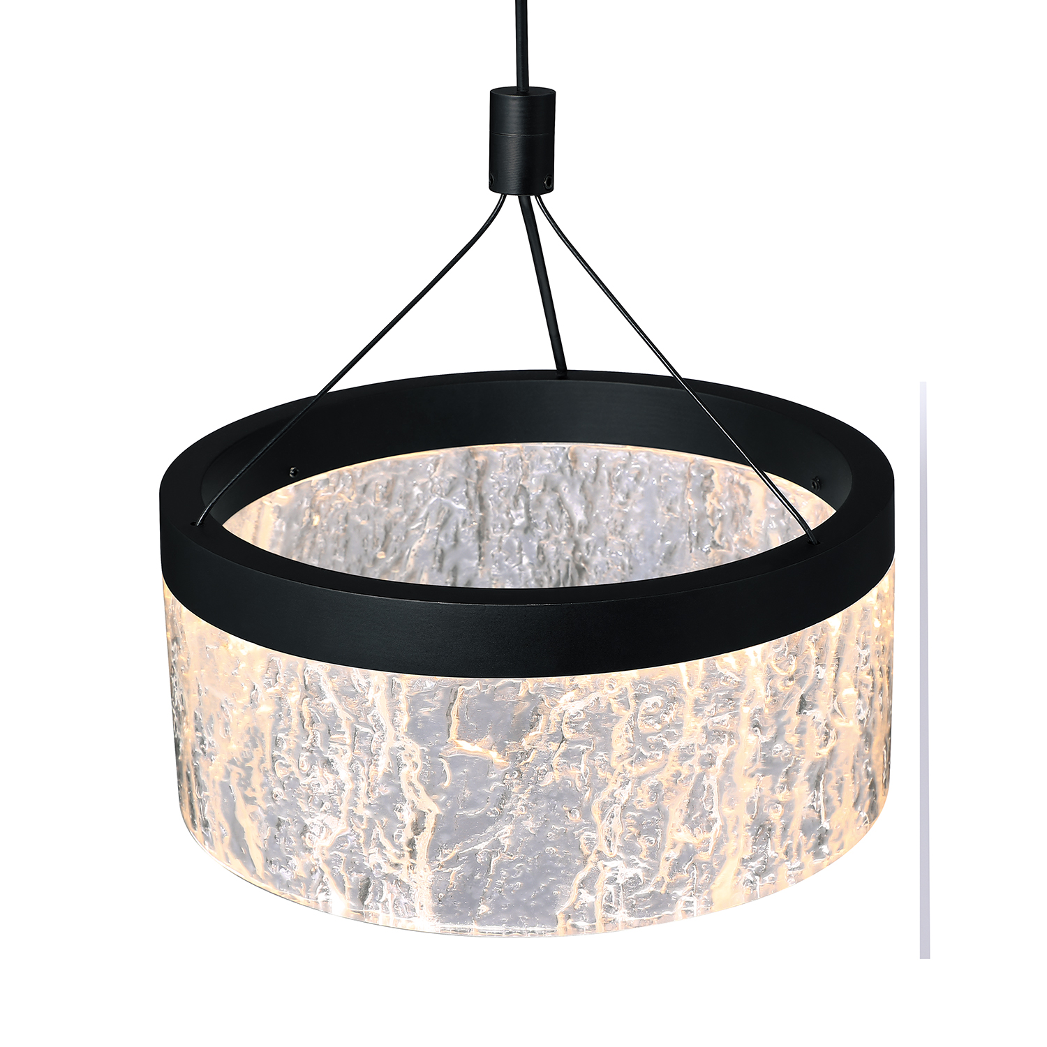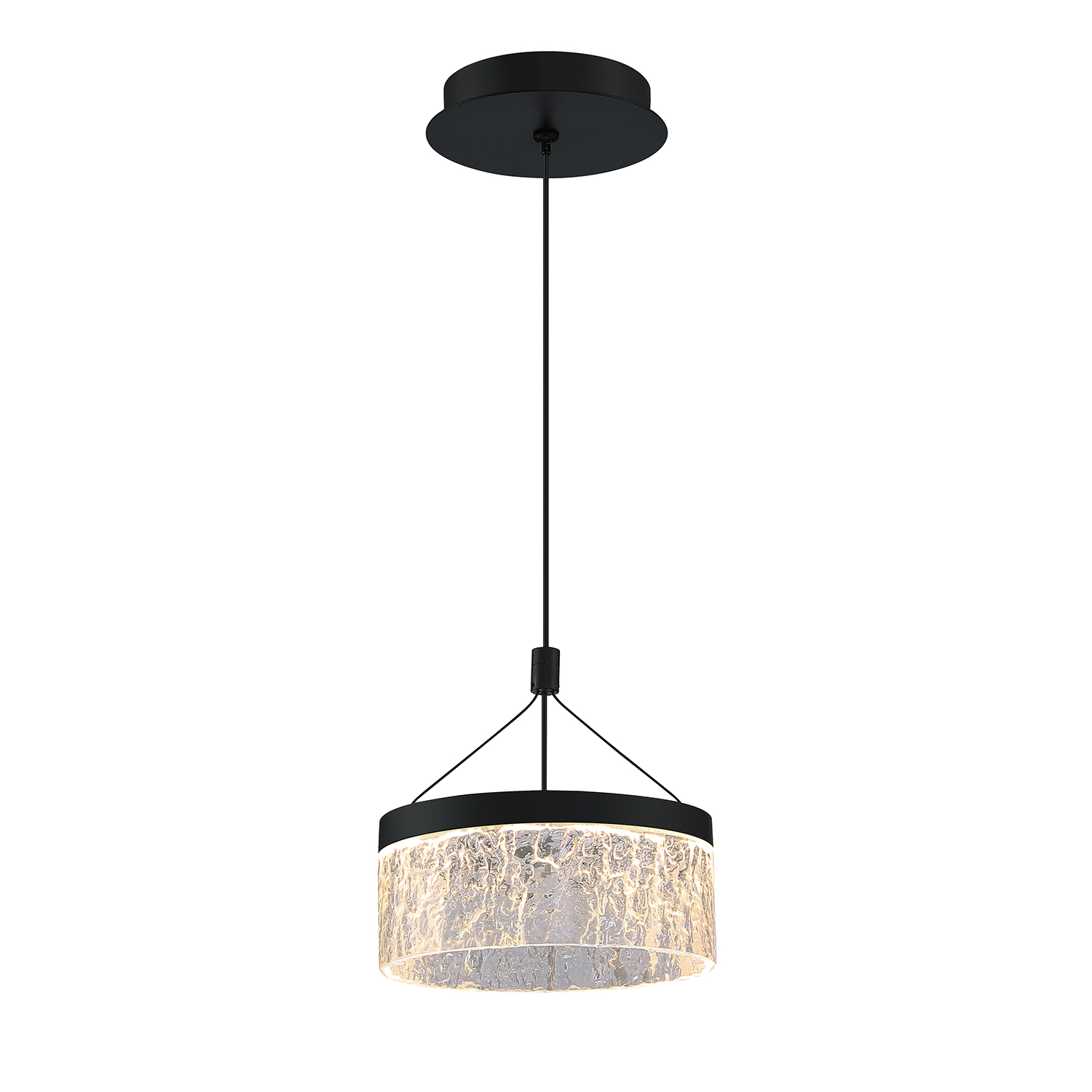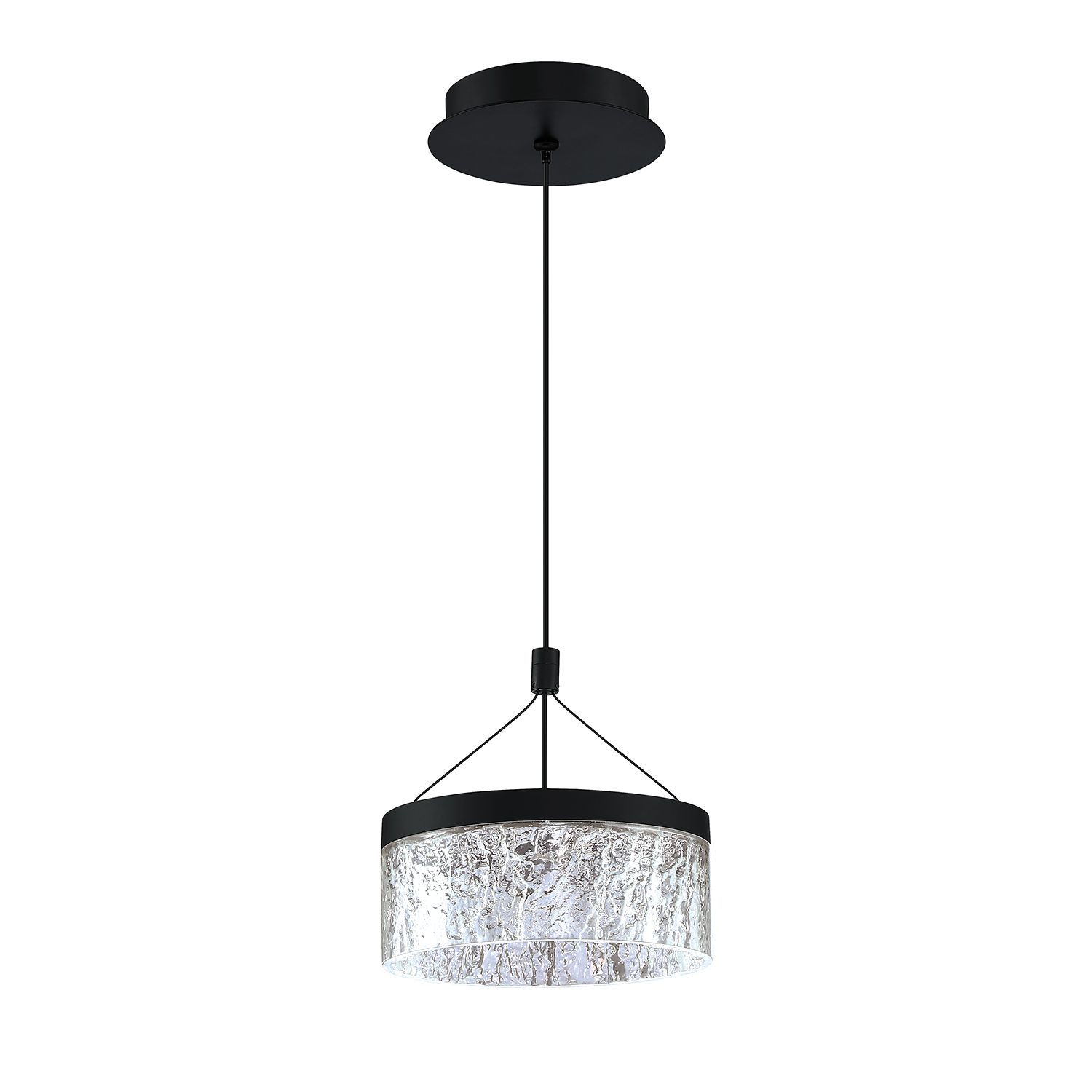 Enhance your space with the ARCTIC ICE 1-Light LED Pendant from the Kendall Lighting ARCTIC ICE Series. This stunning pendant light showcases a sleek black finish that complements any modern decor while featuring an exquisite acrylic ice glass ring that adds a touch of elegance. With a color temperature of 3500K and a CRI of over 80, this integrated LED bulb delivers exceptional brightness and true color representation, making it perfect for dining areas, kitchens, or living rooms. The fixture boasts a compact tier height of 3.1 inches, making it versatile for various ceiling heights and design aesthetics.