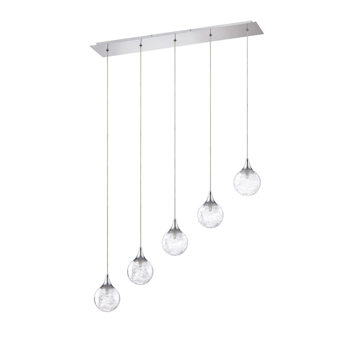 Introducing the FYBRA Series 5-Light Chrome Pendant Bar from Kendall Lighting, a stunning addition that seamlessly blends modern elegance with functional design. This pendant features a sleek chrome finish and showcases mesmerizing stretched glass fibers encased within clear glass globes, creating a captivating visual effect that enhances any interior decor. With an overall width of 34 inches and a maximum overall height of 84 inches, this fixture is ideal for over dining tables, kitchen islands, or entryways, providing ample illumination while serving as a striking focal point in your space.
