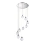 Illuminate your space with the FYBRA Series 9-Light Chrome Pendant from Kendall Lighting, a stunning addition that blends modern elegance with functional design. Featuring a sleek chrome finish, this pendant light showcases nine exquisite lights encased in clear glass globes adorned with stretched glass fibers, creating a captivating visual effect. With an overall width of 22 inches and an adjustable height up to 124 inches, this fixture is perfect for dining areas, entryways, or spacious living rooms, offering both style and versatility to complement your home decor.