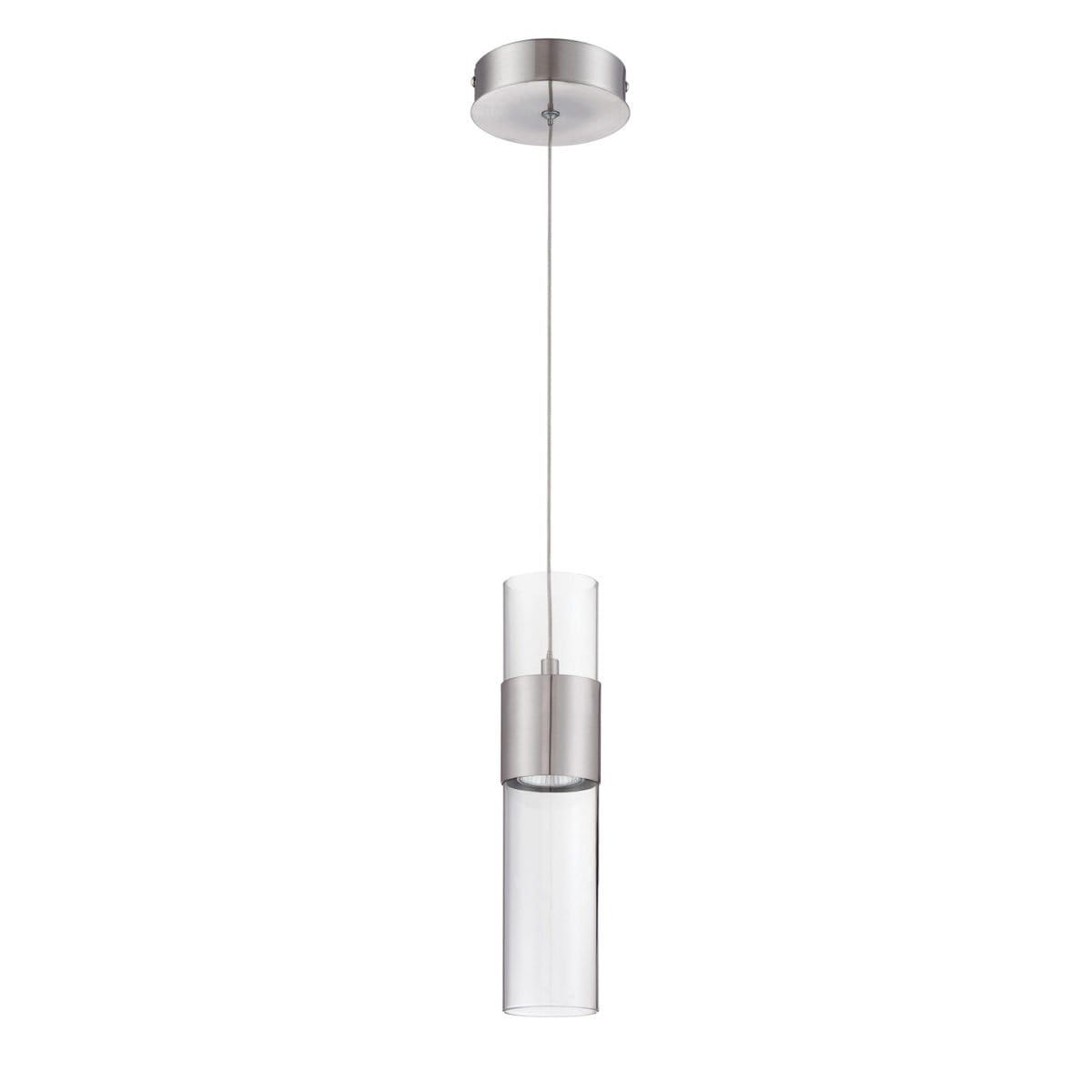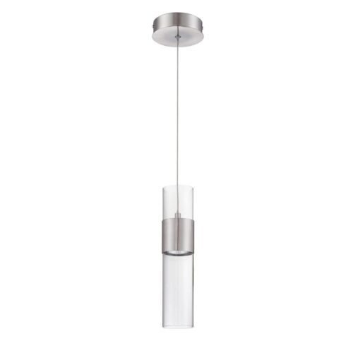 Introducing the LOLA Series 1-Light Satin Nickel GU-10 Pendant from Kendall Lighting, a stunning blend of modern elegance and functional design. With its sleek satin nickel finish, this pendant light is perfect for enhancing any space, be it a stylish kitchen or a contemporary dining area. The top and bottom cylindrical clear glass shades provide an exquisite touch while allowing for maximum light output. Measuring 12 inches in height and 2.75 inches in diameter, this fixture stands out with an overall width of 5 inches, making it an ideal choice for both small and larger areas. Designed to accommodate a GU-10 bulb, this pendant light delivers a powerful 50 watts of illumination, ensuring your environment is well-lit and inviting.