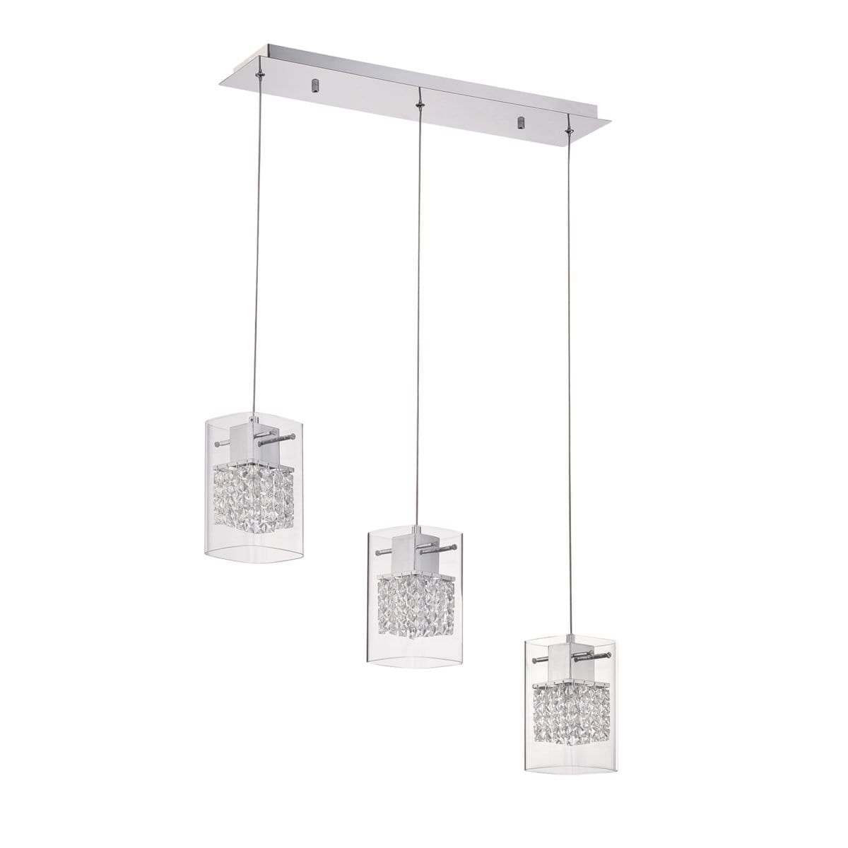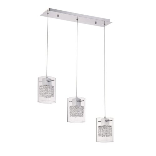 Elevate your space with the Politan Series 3-Light Chrome Pendant Bar from Kendall Lighting, a stunning blend of contemporary design and flawless craftsmanship. This exquisite lighting fixture features a sleek chrome finish that effortlessly complements any modern decor, while the clear outer glass shades encase intricate chains of optic crystal arranged in a captivating cube pattern. With an adjustable overall height of up to 79 inches and dimensions of 7.5 inches in height and 4.75 inches in width for each shade, this pendant bar is perfect for illuminating dining areas, kitchen islands, or entryways, providing a stylish focal point that radiates elegance.