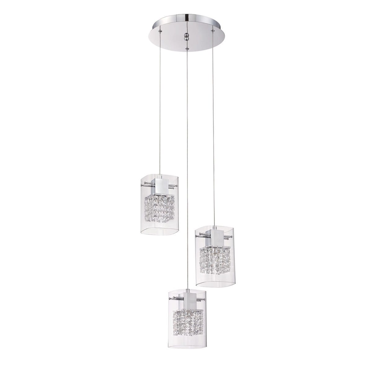 Illuminate your space with the Politan Series 3-Light Chrome Pendant from Kendall Lighting, a stunning addition to any modern home decor. This elegant pendant light features a sleek chrome finish that seamlessly complements the clear outer glass shades, which beautifully encase intricate chains of optic crystal arranged in a striking cube pattern. With a height of 7.5 inches and a width of 4.75 inches, the shades provide not only a captivating visual appeal but also an effective source of light for dining areas, kitchens, or living spaces. The adjustable overall height allows for customized installation, making it adaptable to various ceiling heights while maintaining its contemporary charm.