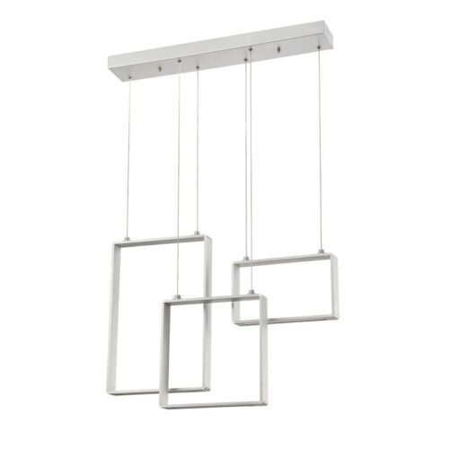 Illuminate your space with the QUADRON 3-Light Aluminum LED Pendant Bar from Kendall Lighting’s QUADRON Series, a perfect blend of modern design and functional lighting. Crafted from high-quality metal and featuring an elegant aluminum finish, this pendant bar makes a bold statement in any room. The sleek design includes three uniquely sized pendants—one measuring 7 in. x 12 in., another at 12 in. x 12 in., and the largest at 18 in. x 12 in.—suspended from a stylish canopy that measures 27.5 in. long and 4.3 in. wide. With integrated LED bulbs totaling 27 watts, this fixture not only enhances aesthetics but also provides energy-efficient lighting to brighten up your dining area, kitchen, or living space.