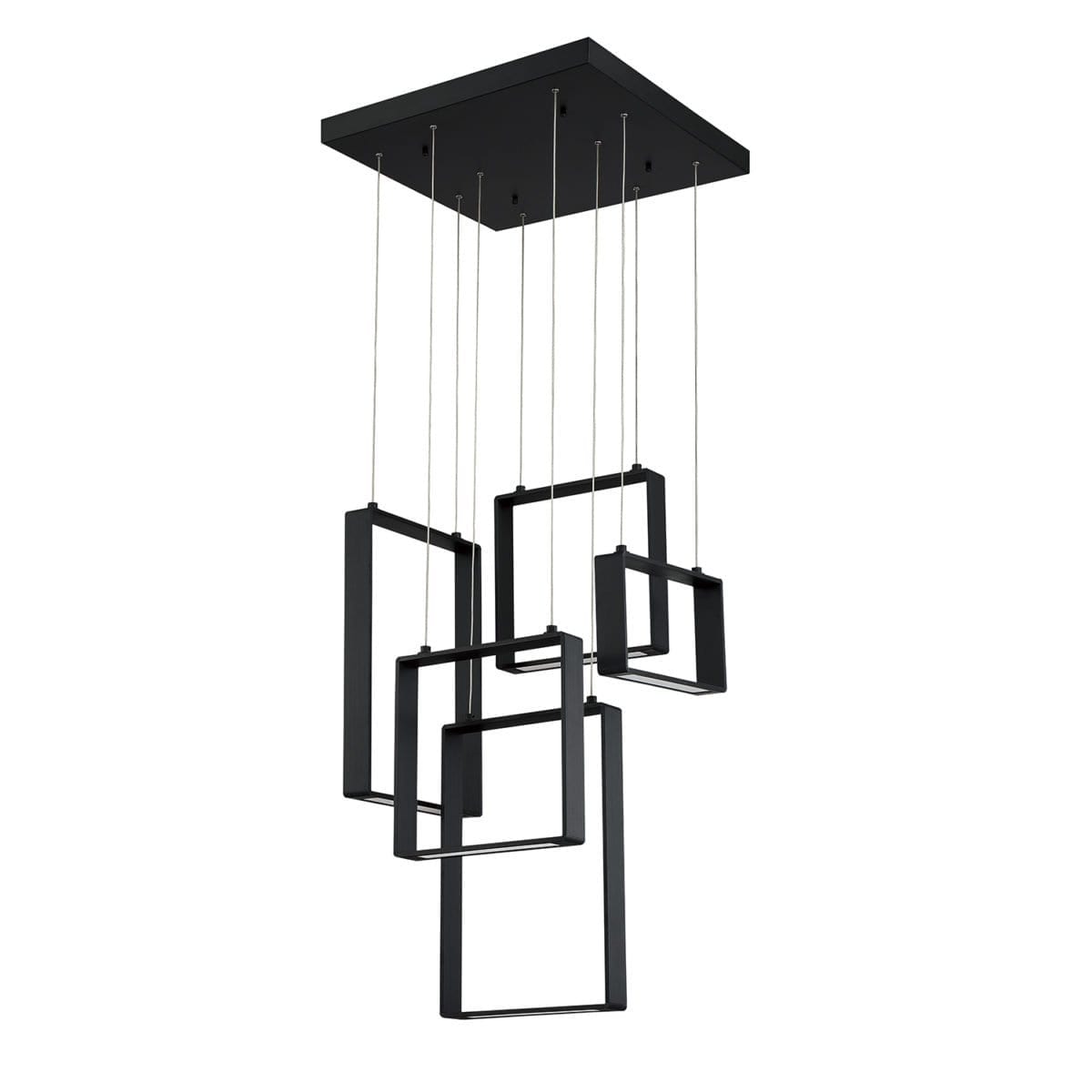 Introducing the QUADRON 5-Light Black LED Pendant Pan from Kendall Lighting, an exquisite addition to any modern space. This stunning pendant features a sleek black finish and a versatile rectangular design, measuring 20 inches in length and width. With five distinct pendant sizes, including one at 7 inches by 12 inches, two at 12 inches by 12 inches, and two at 18 inches by 12 inches, this fixture is designed to create a dynamic visual appeal. The integrated LED bulbs deliver an impressive 45 watts of illumination, ensuring your environment remains bright and stylish while being energy-efficient. Constructed from high-quality metal and featuring durable acrylic shades, the QUADRON pendant promises longevity and resilience.