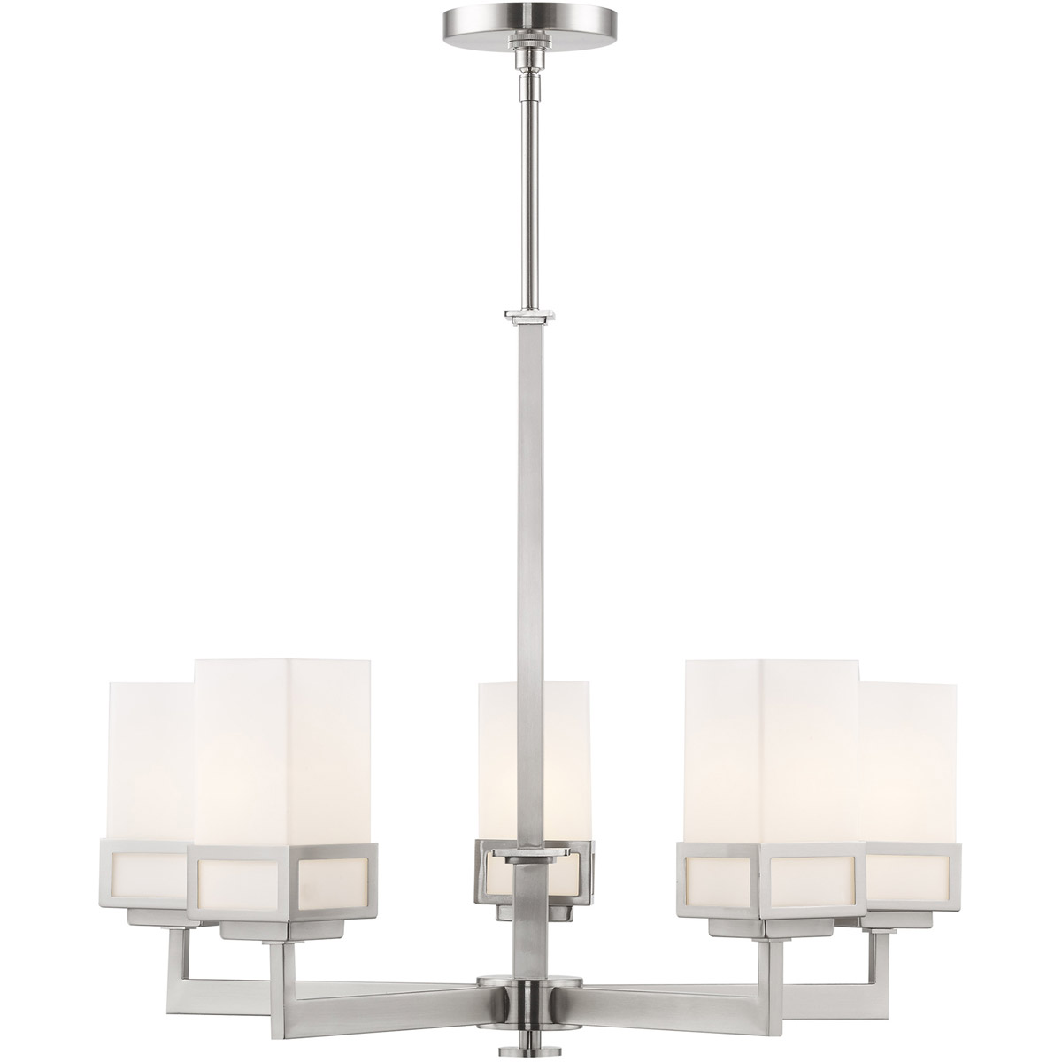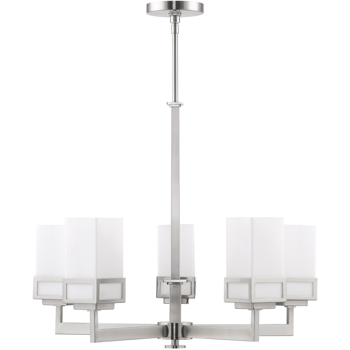 The transitional style of the Harding five light chandelier features an eye-catching satin opal white glass shade floating inside a unique double forged square design in a brushed nickel finish.