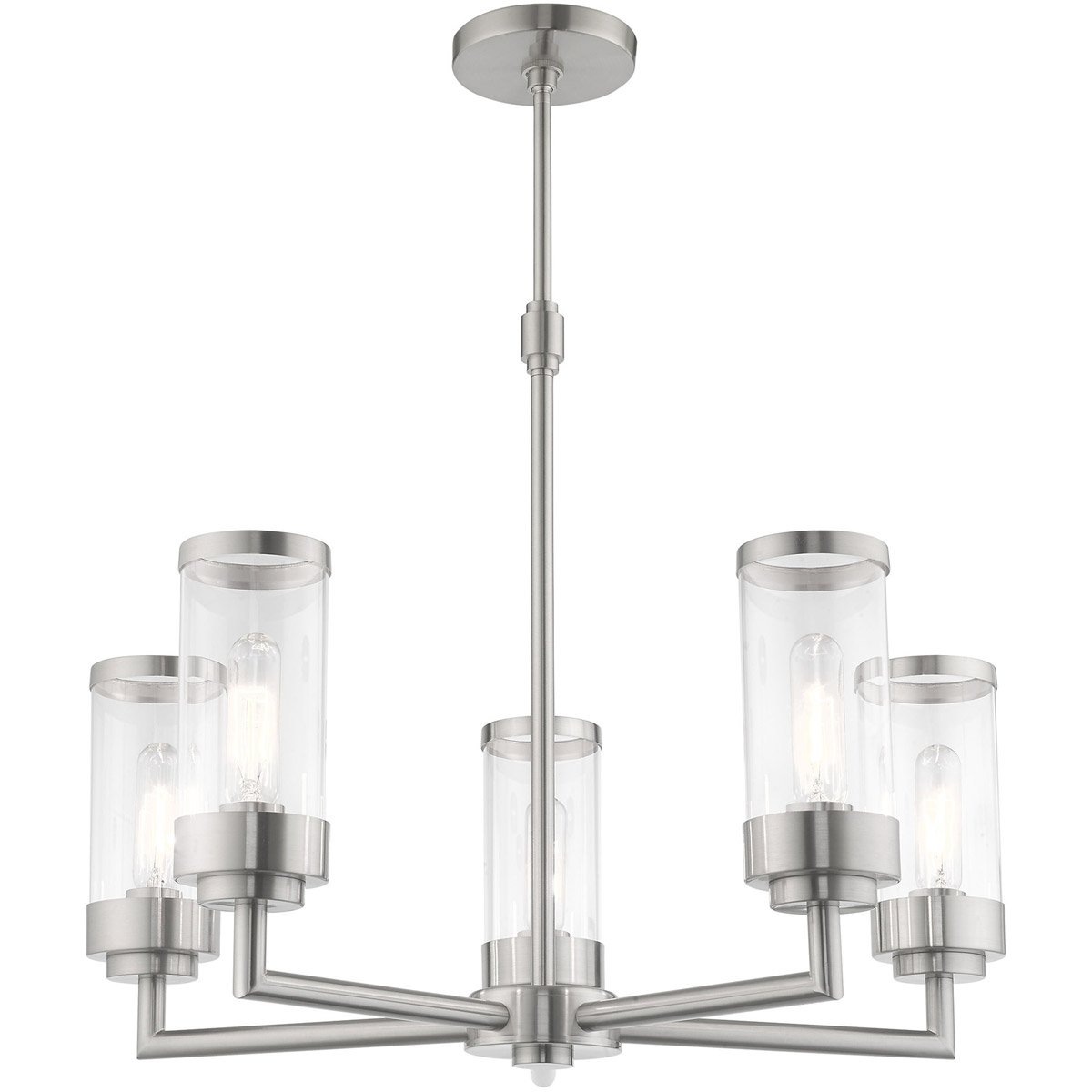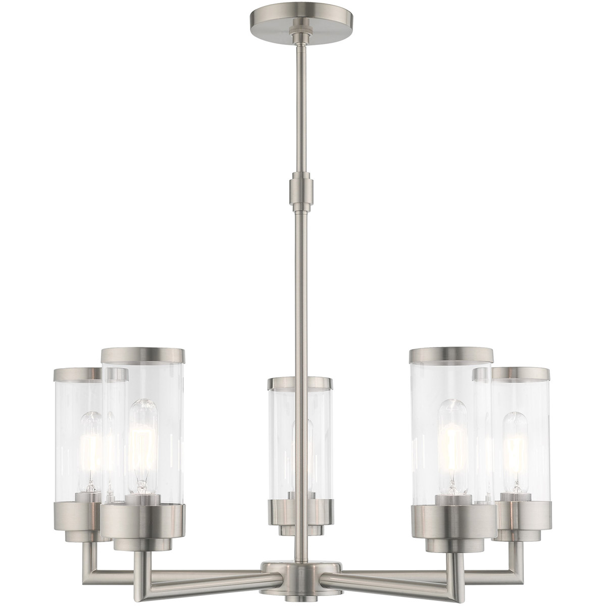 The five light chandelier from the Hillcrest collection features a simple elegant brushed nickel frame paired with clear glass shades. Each shade is accented with a banded brushed nickel ring to carry through the theme of finely crafted metal fittings.