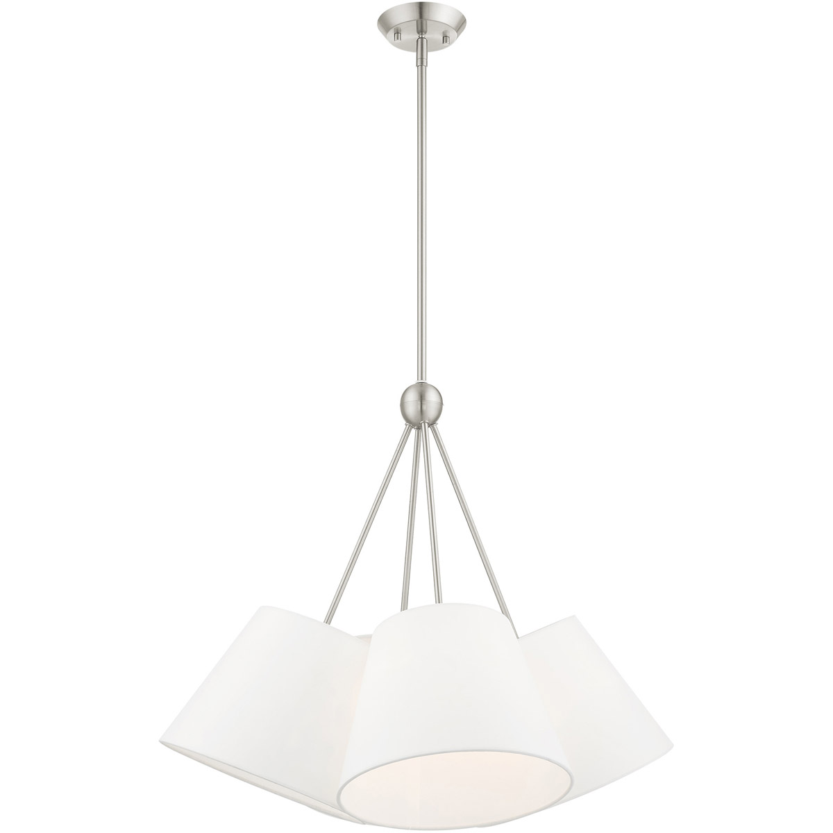 The Prato collection is both modern and versatile. The hand-crafted off-white colored fabric hardback shade sets a pleasant and current mood. The four-light shade cluster add character to this handsomely styled pendant. Perfect fit for the living room, dining room, kitchen and bedroom. This sleek design is shown in a brushed nickel finish.