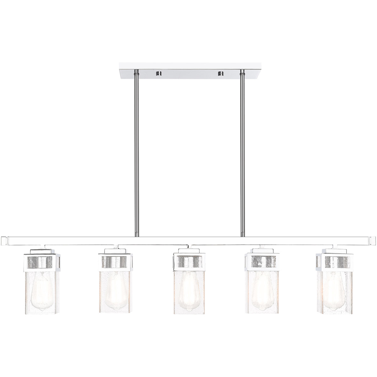 The transitional style of the Harding five light linear chandelier features an eye-catching clear seeded glass shade floating inside a unique double forged square design in a polished chrome finish.