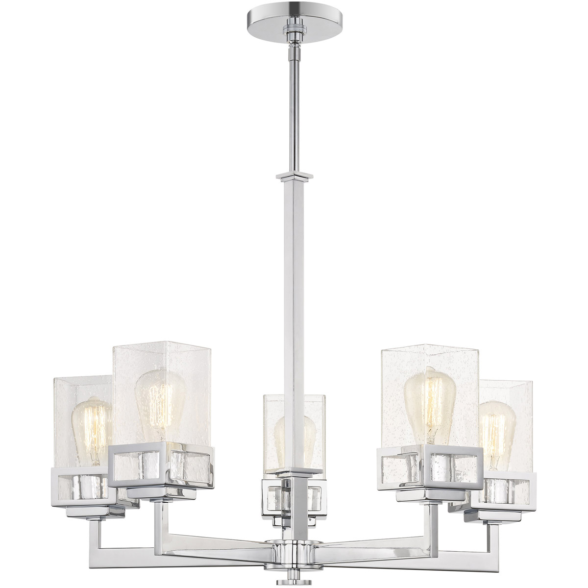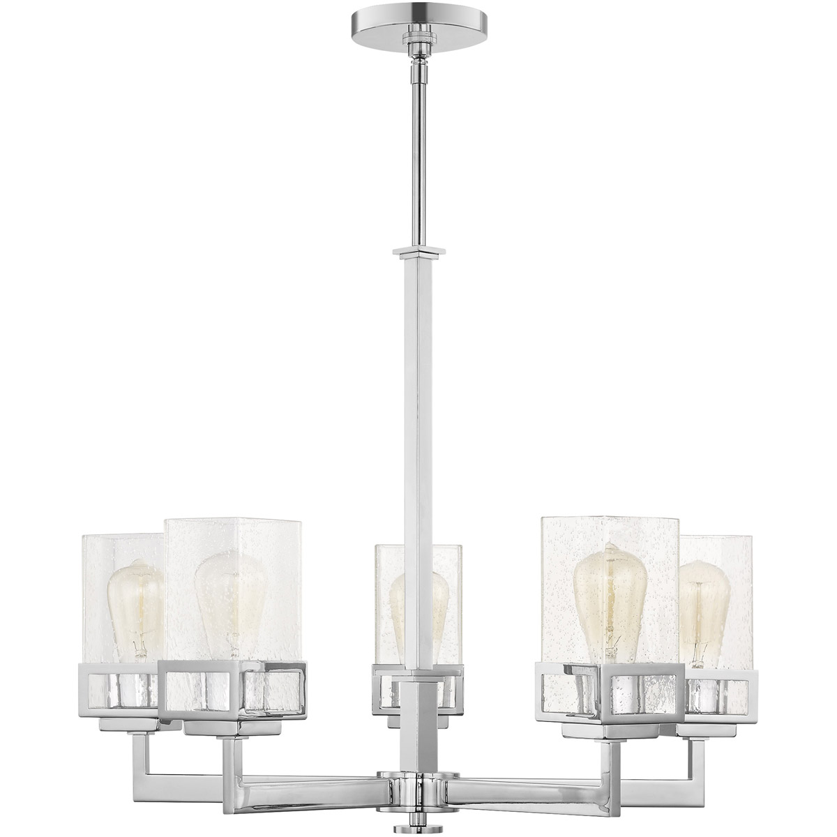 The transitional style of the Harding five light chandelier features an eye-catching clear seeded glass shade floating inside a unique double forged square design in a polished chrome finish.