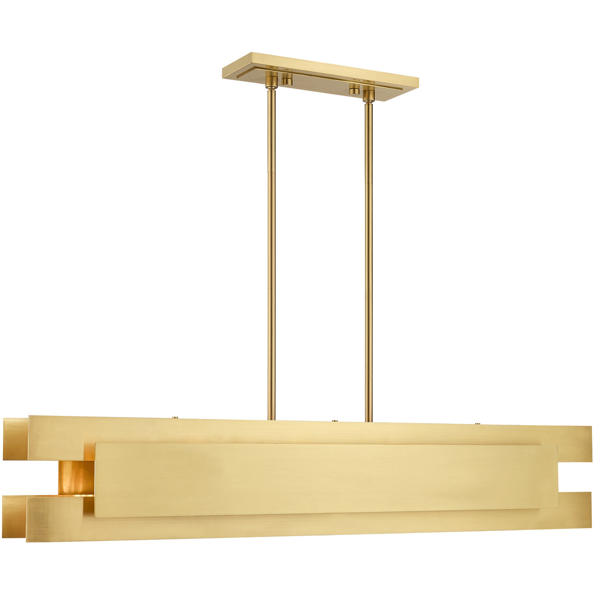 This stylish, modern five light linear chandelier features a chic look and can be mounted any where in the home from over a kitchen island or dining table. Its light design is created with square and rectangular panels of solid brass in a satin brass finish.