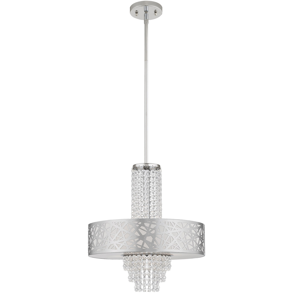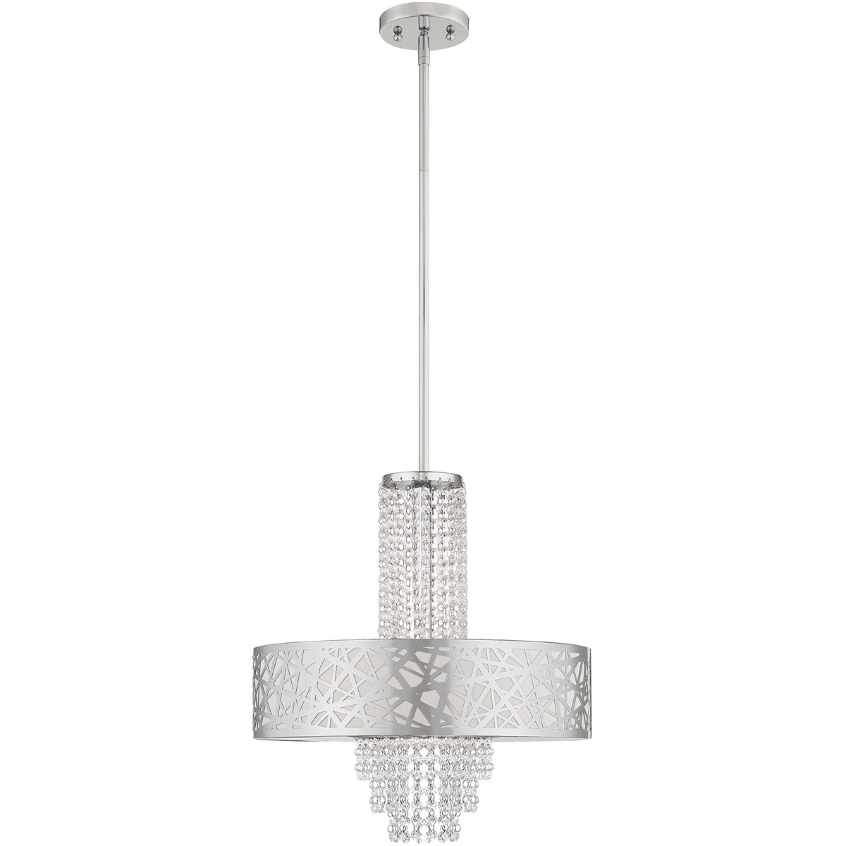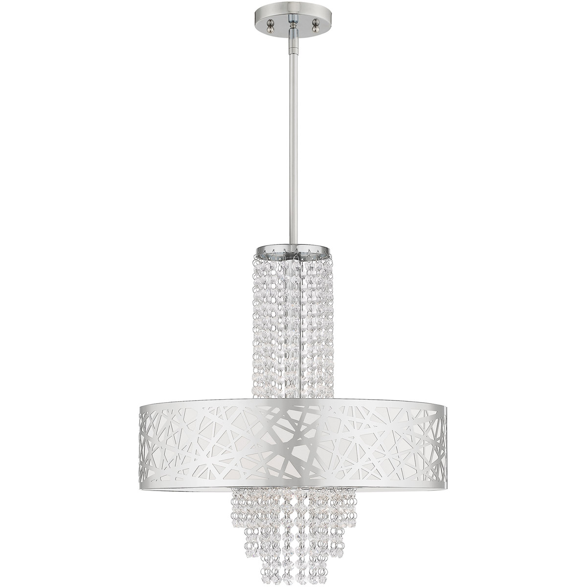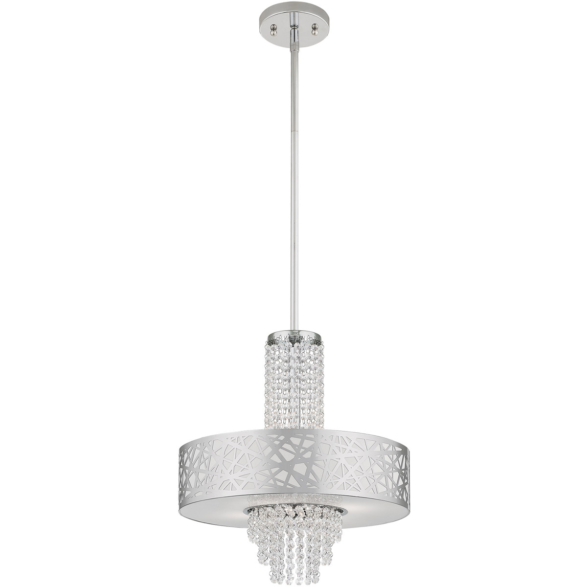 This spectacular polished chrome four light pendant will take your home decor to the next level. Inspired by a bird nest, the laser-cut metal sheath surrounds an off-white fabric hardback shade with strands of glistening clear crystal.