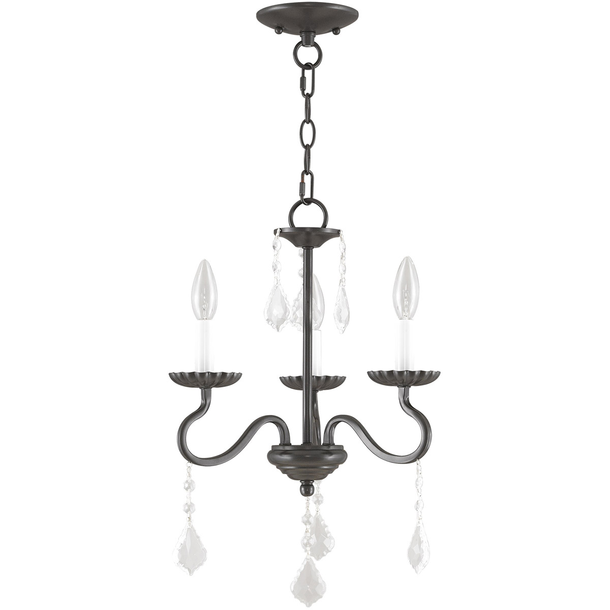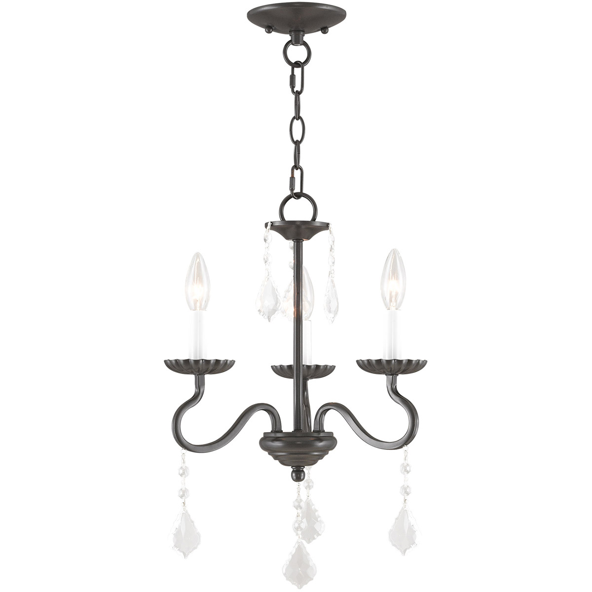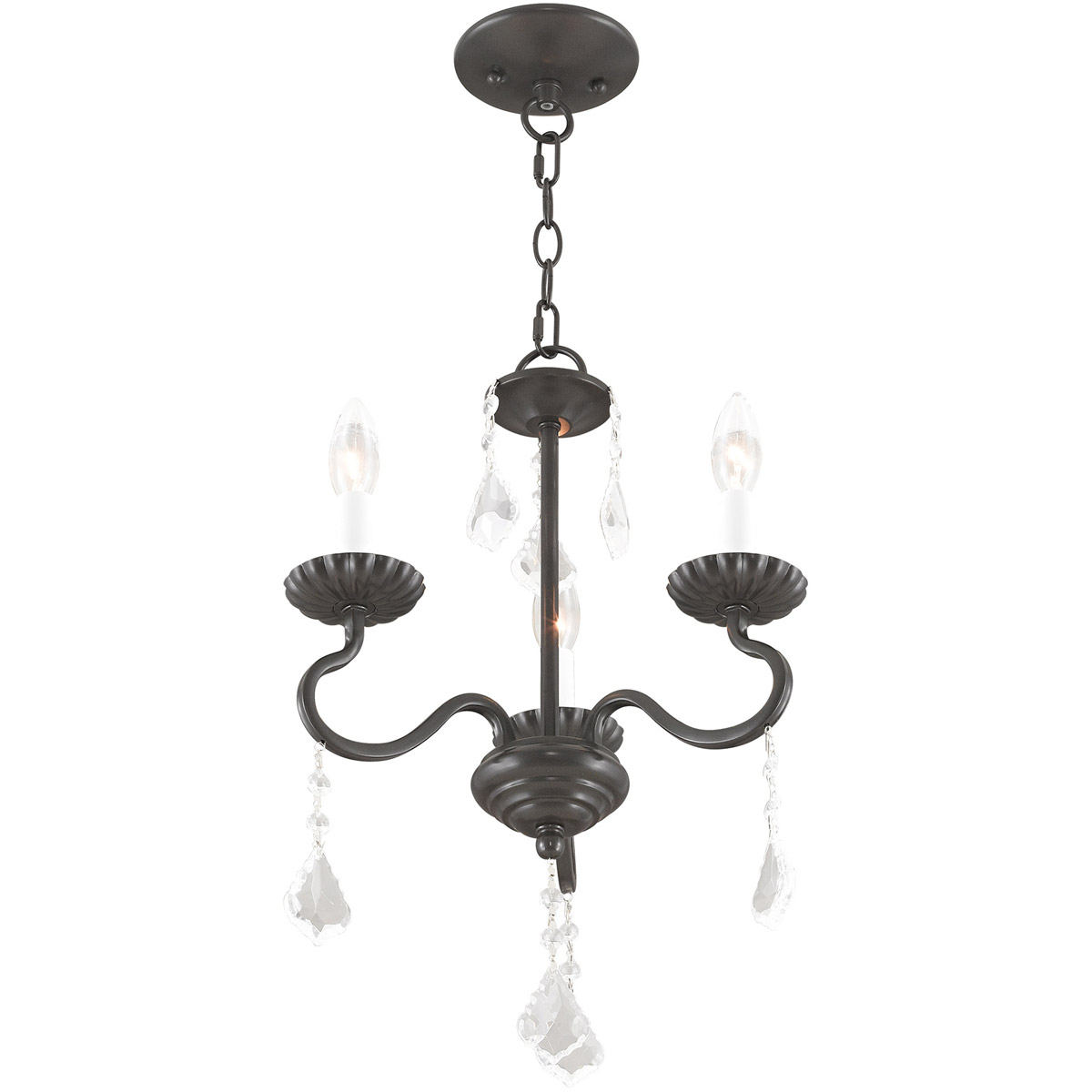 Clear crystals accent the delicate scrollwork of this decorative frame on this three light English bronze mini chandelier that make a traditional interior come together.