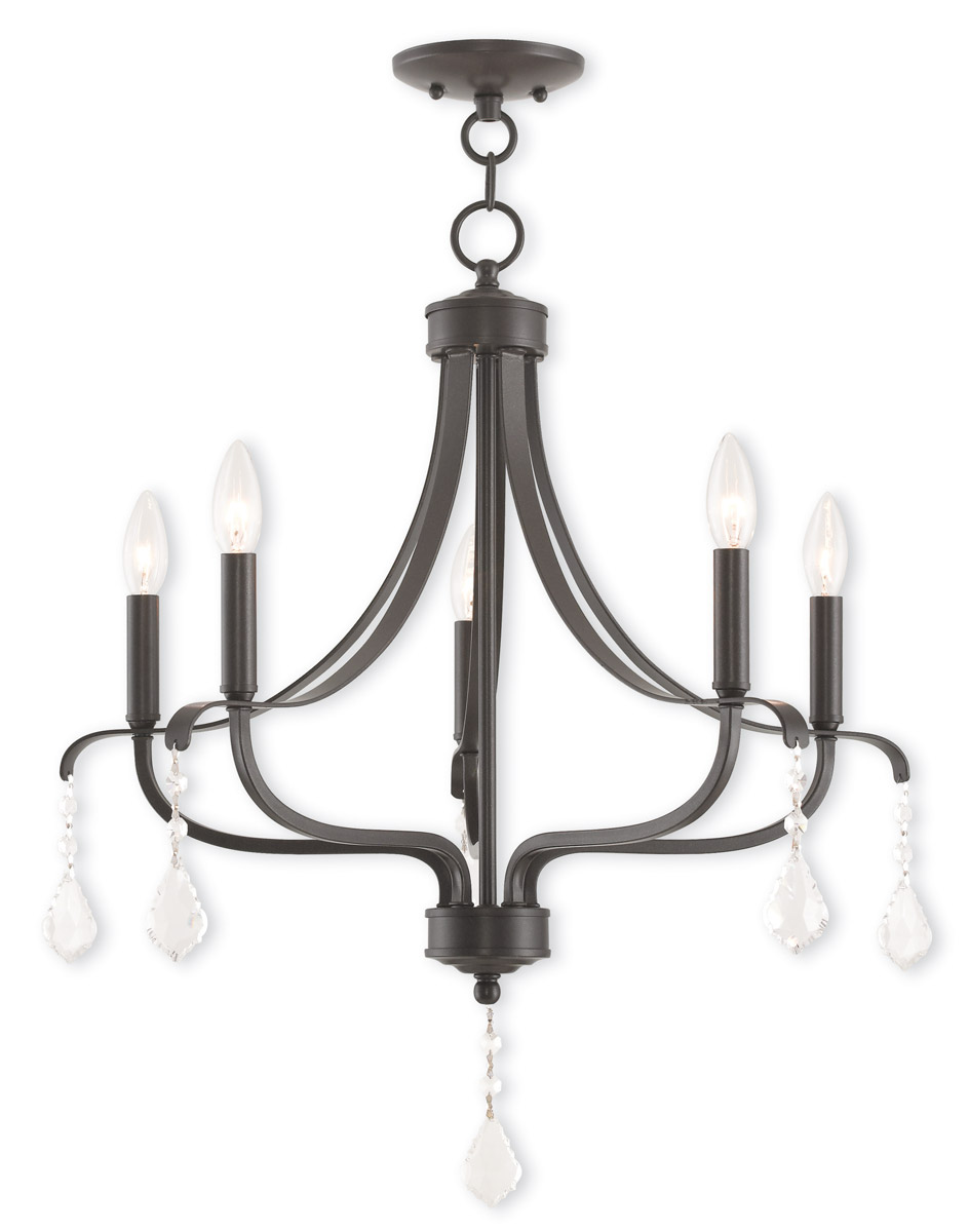 Faceted clear crystals drop beautifully from the transitional, scrolling form of this five light chandelier. The design is beautiful and appealing, with a English bronze finish. This chandelier is perfect for any room in your house.