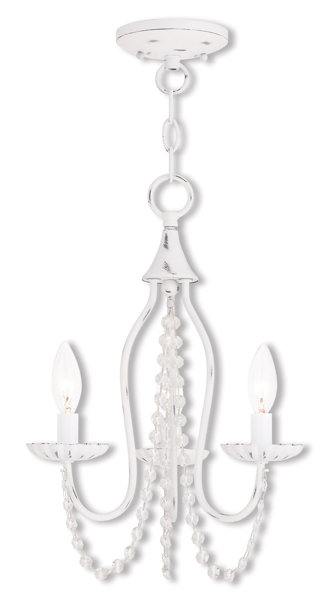 The simplicity of this three arm mini chandelier in antique white is gently draped with clear crystal trim making this an ideal fixture for many different decor settings.