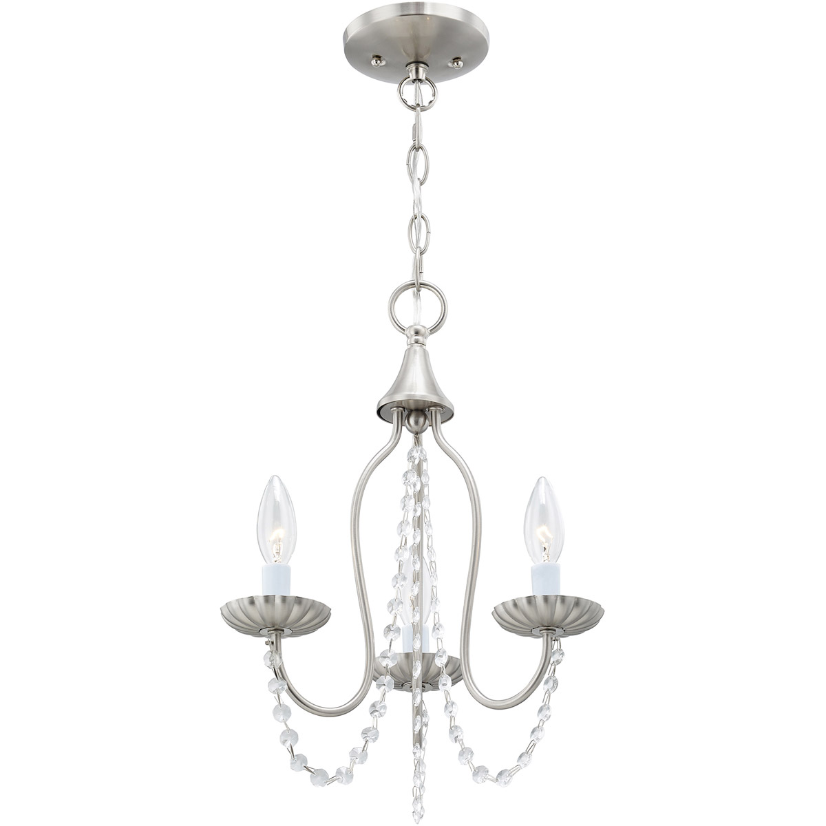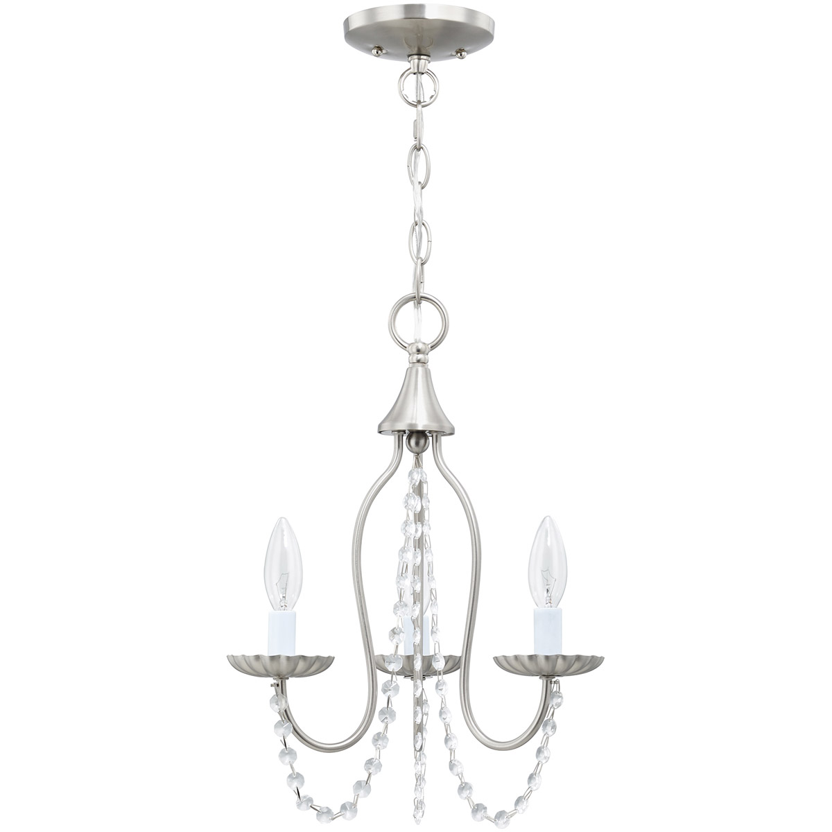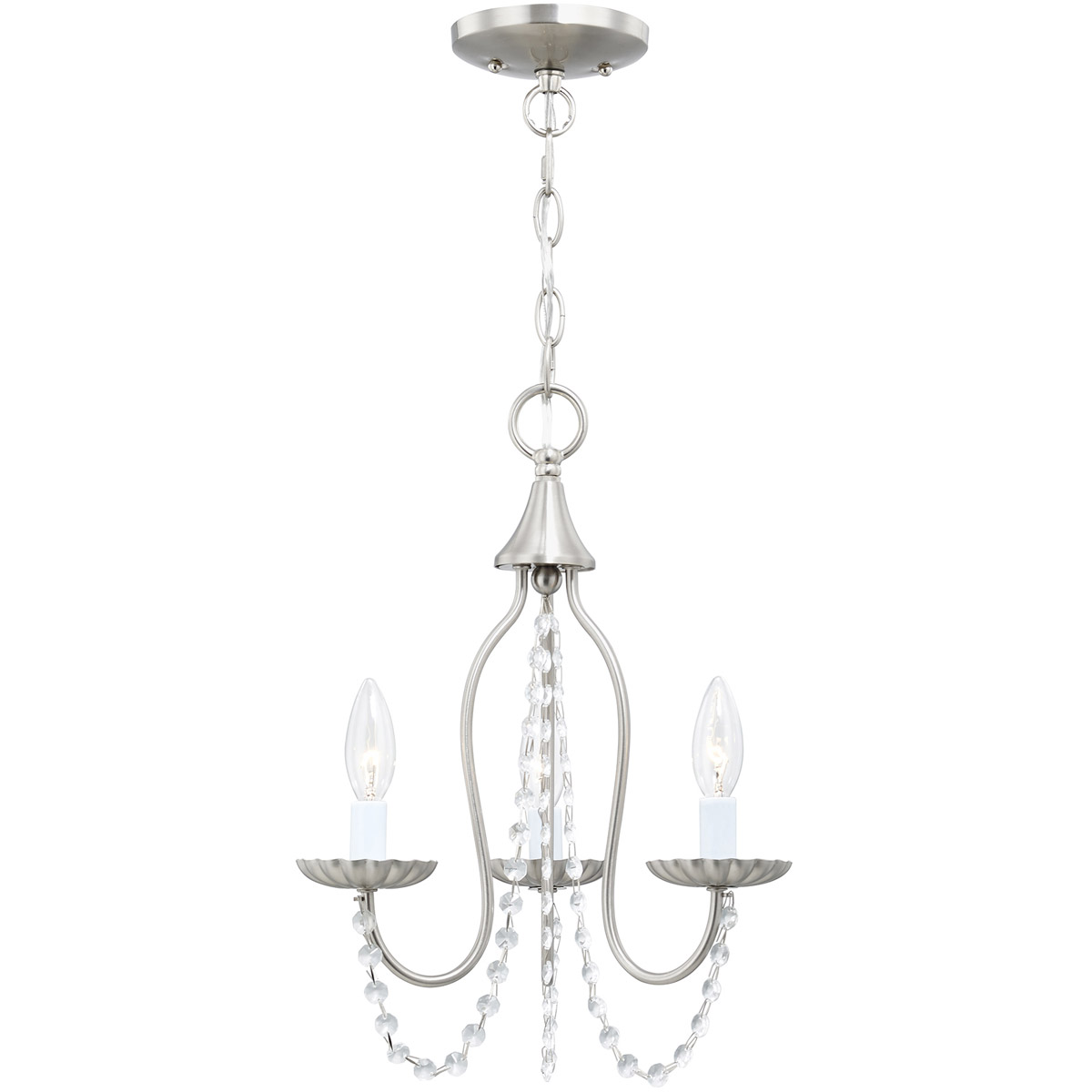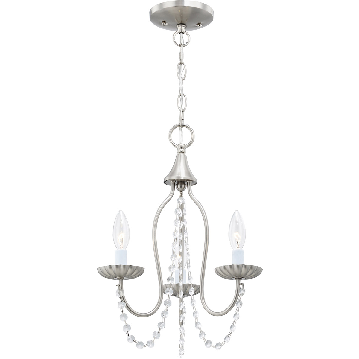 The simplicity of this three arm mini chandelier in brushed nickel is gently draped with clear crystal trim making this an ideal fixture for many different decor settings.