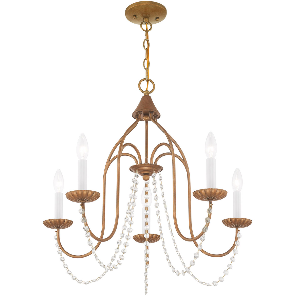 The simplicity of this five arm chandelier in antique gold leaf is gently draped with clear crystal trim making this an ideal fixture for many different decor settings.