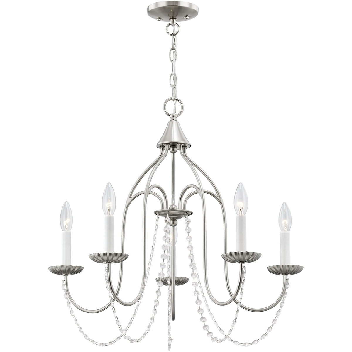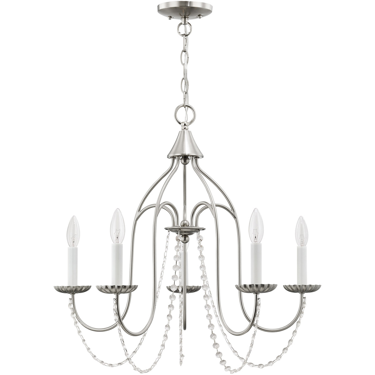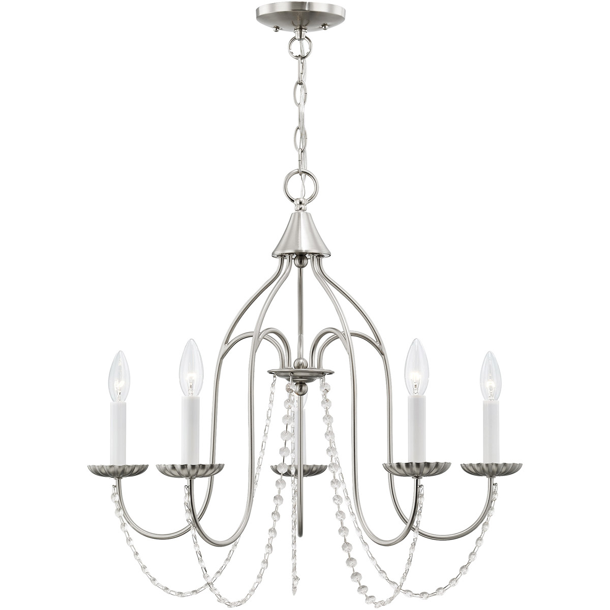 The simplicity of this five arm chandelier in brushed nickel is gently draped with clear crystal trim making this an ideal fixture for many different decor settings.