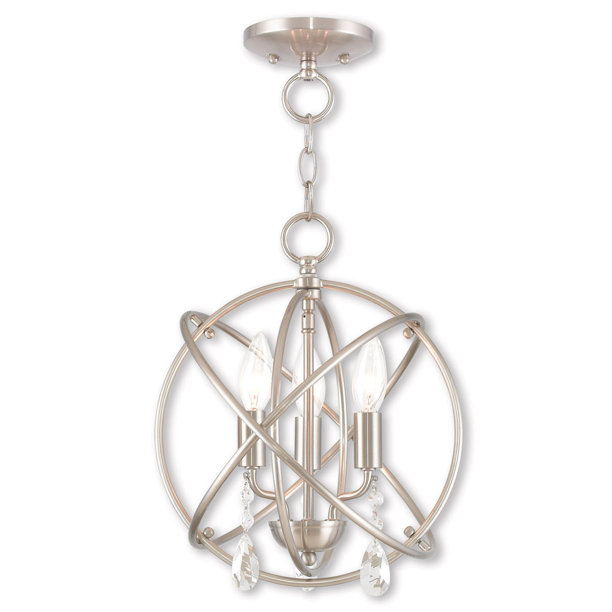 Delicate dangling crystals add a luxurious counterpoint to this brushed nickel orb. The three arm cluster nestled within orbiting rings features teardrop crystals. Use a couple of these fixtures over your kitchen island or convert this to a ceiling mount for your hallway or bathroom.