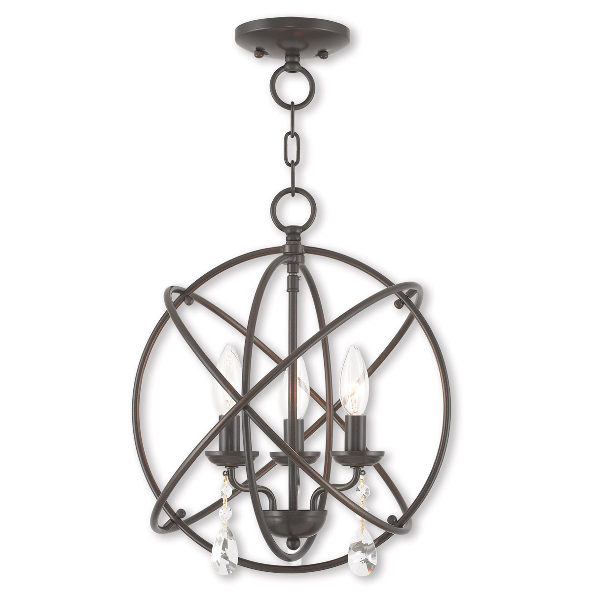 Delicate dangling crystals add a luxurious counterpoint to this English bronze orb. The three arm cluster nestled within orbiting rings features teardrop crystals. Use a couple of these fixtures over your kitchen island or convert this to a ceiling mount for your hallway or bathroom.