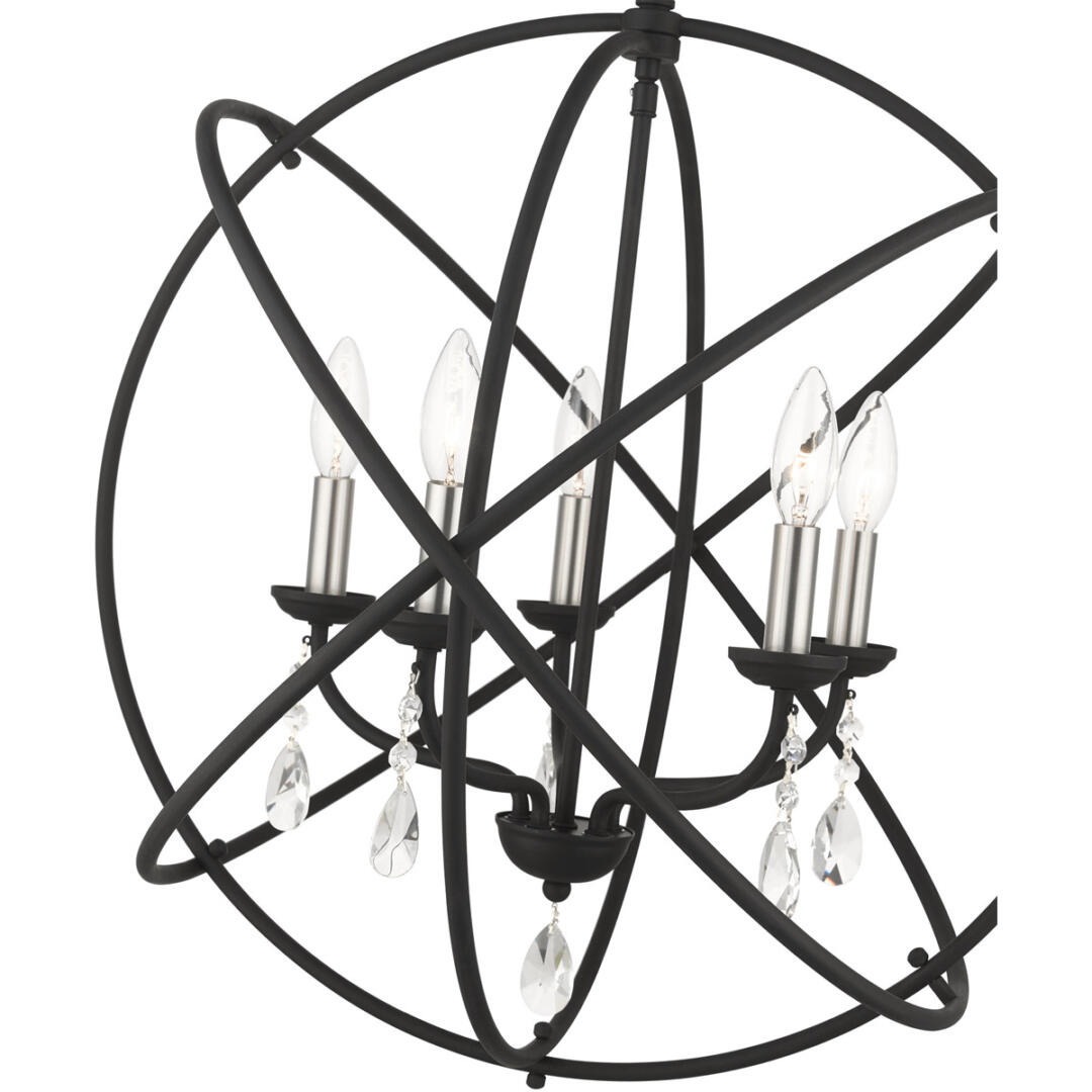 The delicate dangling crystals of the Aria collection adds an eclectic counterpoint to the luxurious orb. The five-arm light cluster nestled within orbiting rings features faceted clear teardrop crystals. This fixture will look fabulous in the dining room, bedroom or in the living room. With its easy installation and low upkeep requirements, this light will not disappoint. It is shown in a black finish with brushed nickel finish candles.