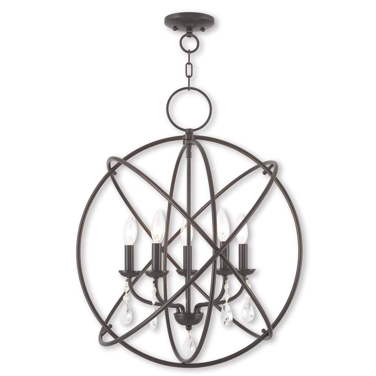 Delicate dangling crystals add a luxurious counterpoint to this English bronze orb. The five arm cluster nestled within orbiting rings features teardrop crystals. This chandelier is perfect for dining rooms or to give a little pizzazz to your kitchen dining area