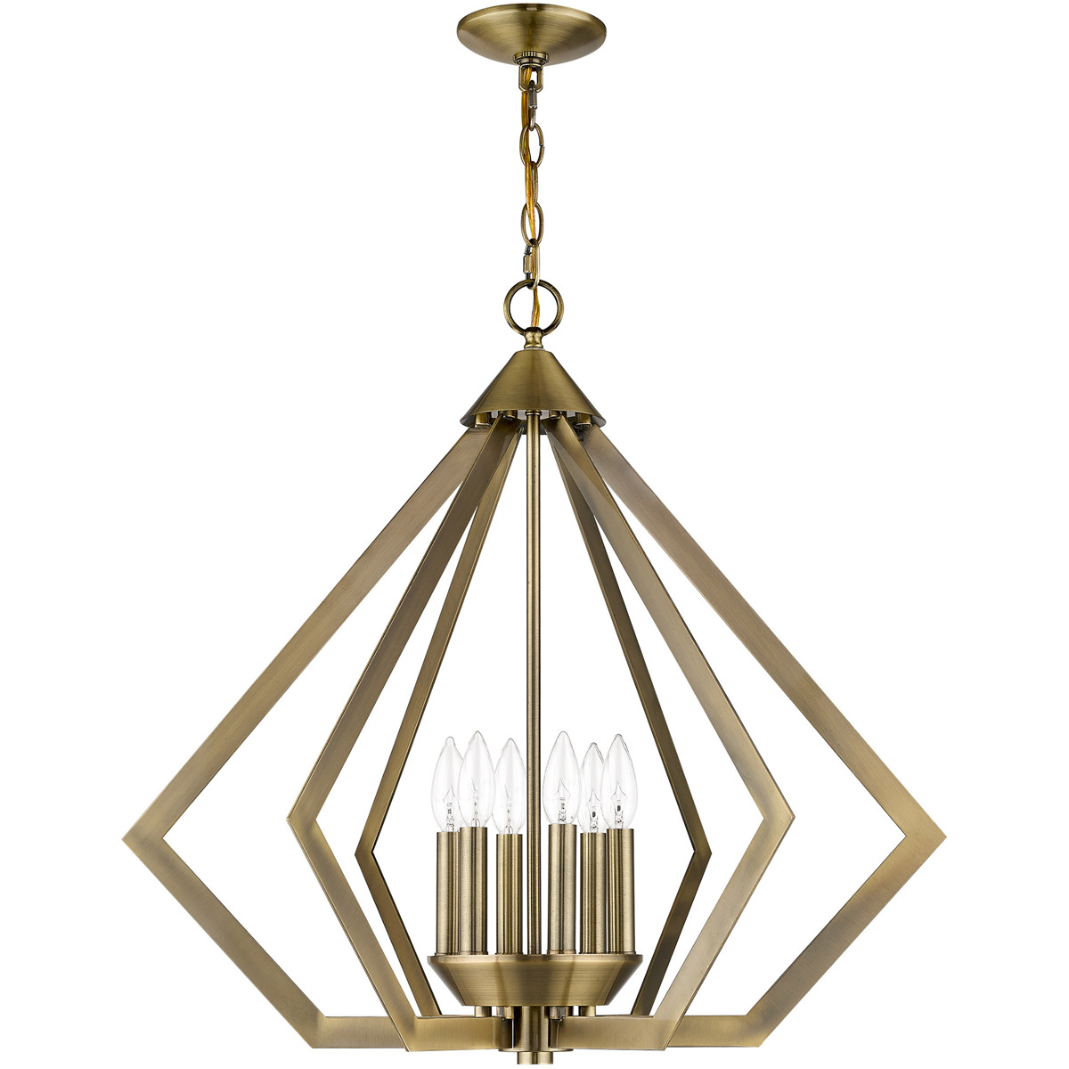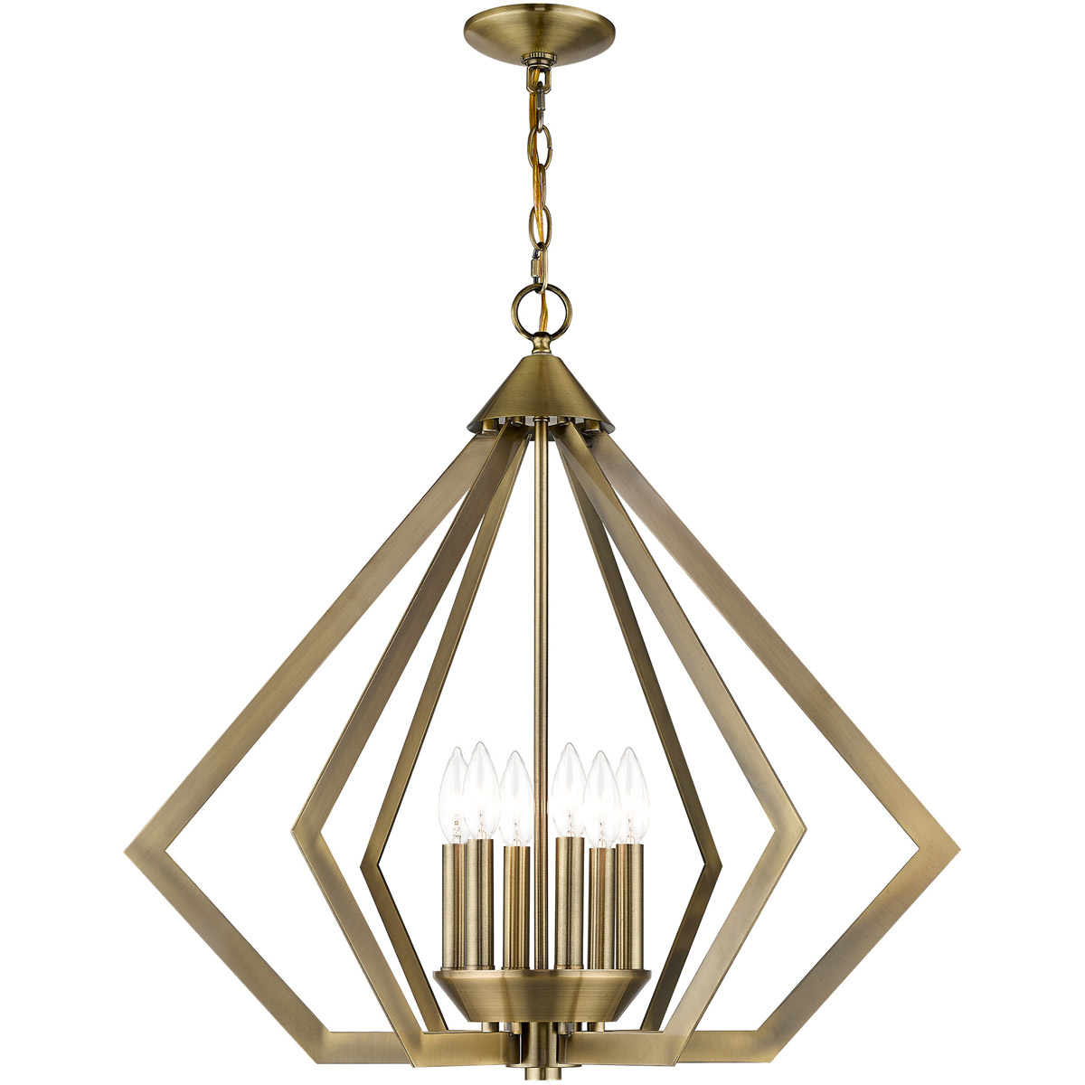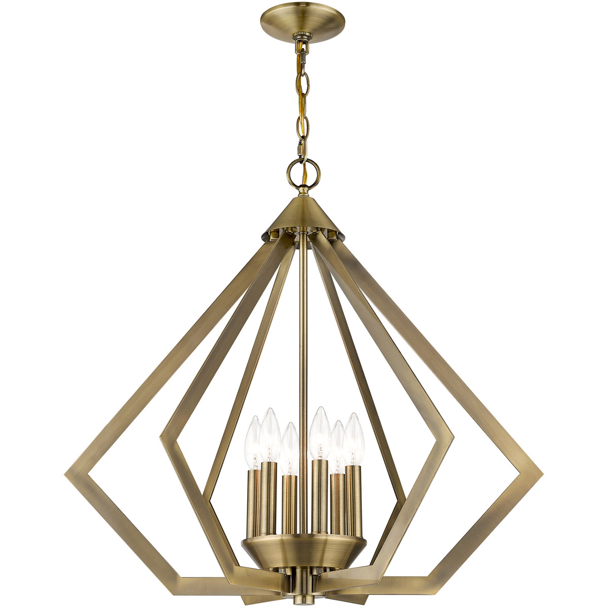 Sleek and contemporary, our Prism collection is influenced by modern industrial style. This chandelier features a antique brass finish which has a striking triangular shape.