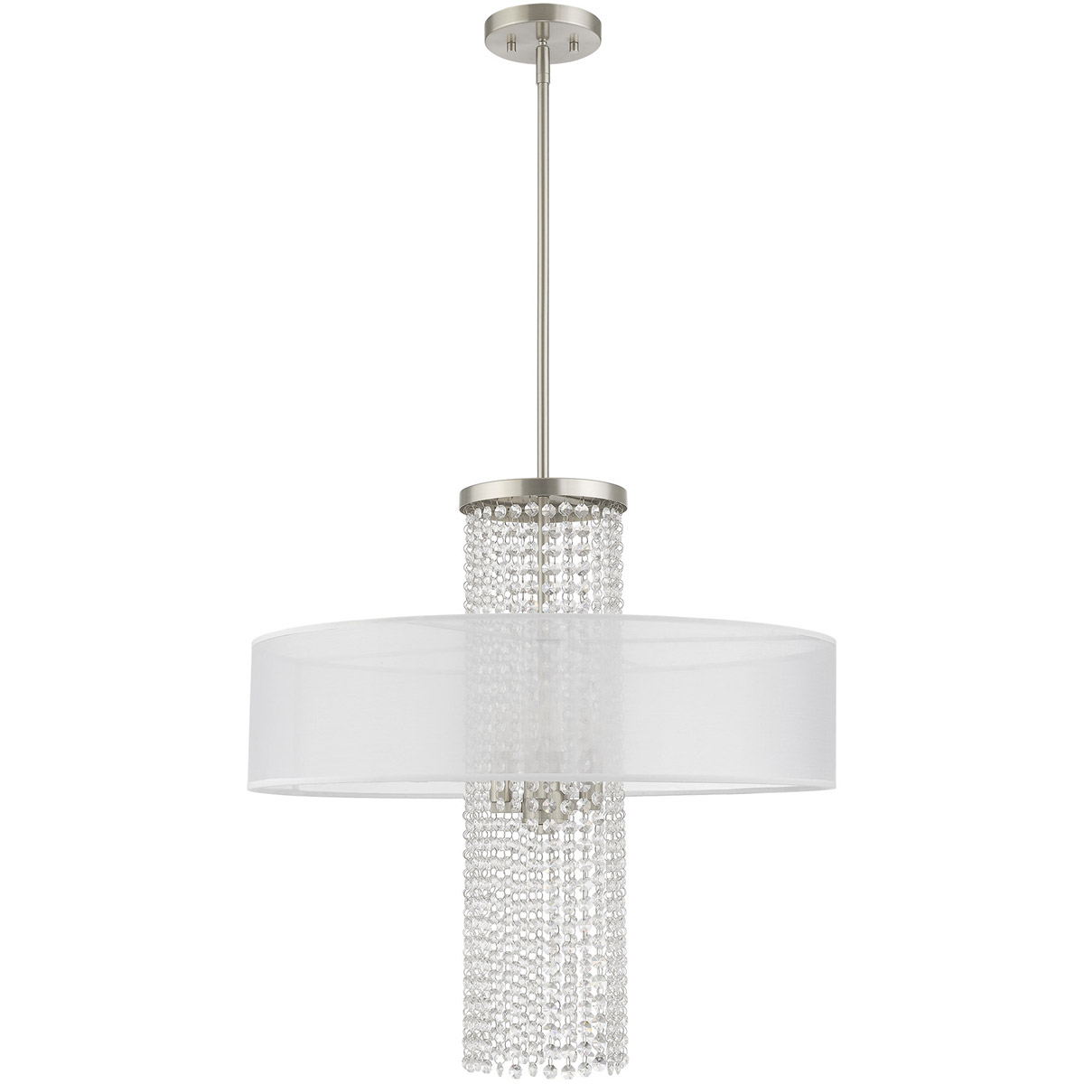 | Glass/Shade Type: Clear Crystals/ Hand Crafted Translucent Fabric Shade | Diameter: 24 Inch |