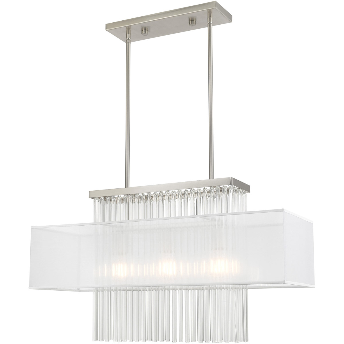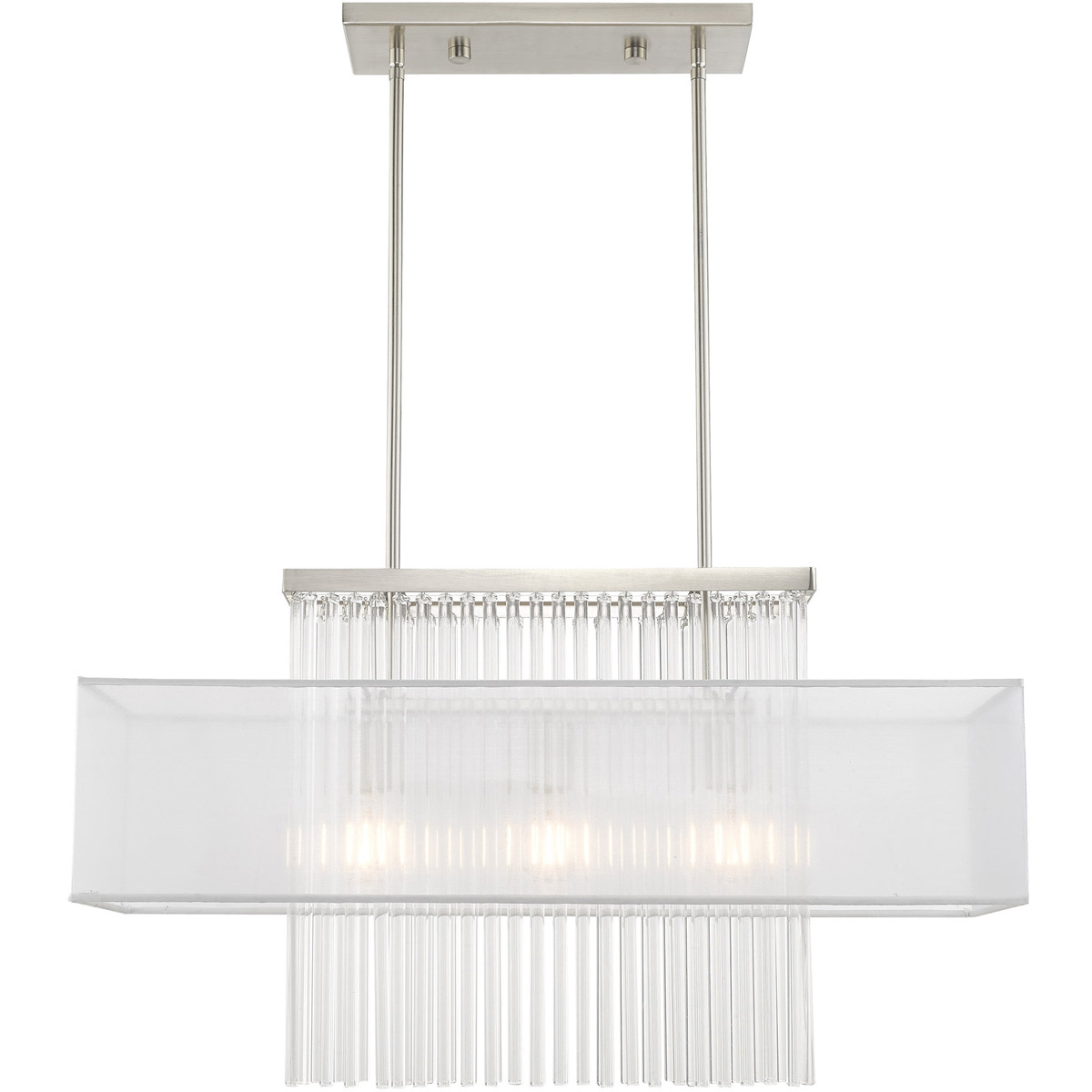 Dazzle contemporary decor schemes with the upscale feel of this elegant linear chandelier. The Alexis fills a bling quotient with beautiful grade-A K9 crystal rods that cascades from a brushed nickel base with a hand crafted translucent shade.
