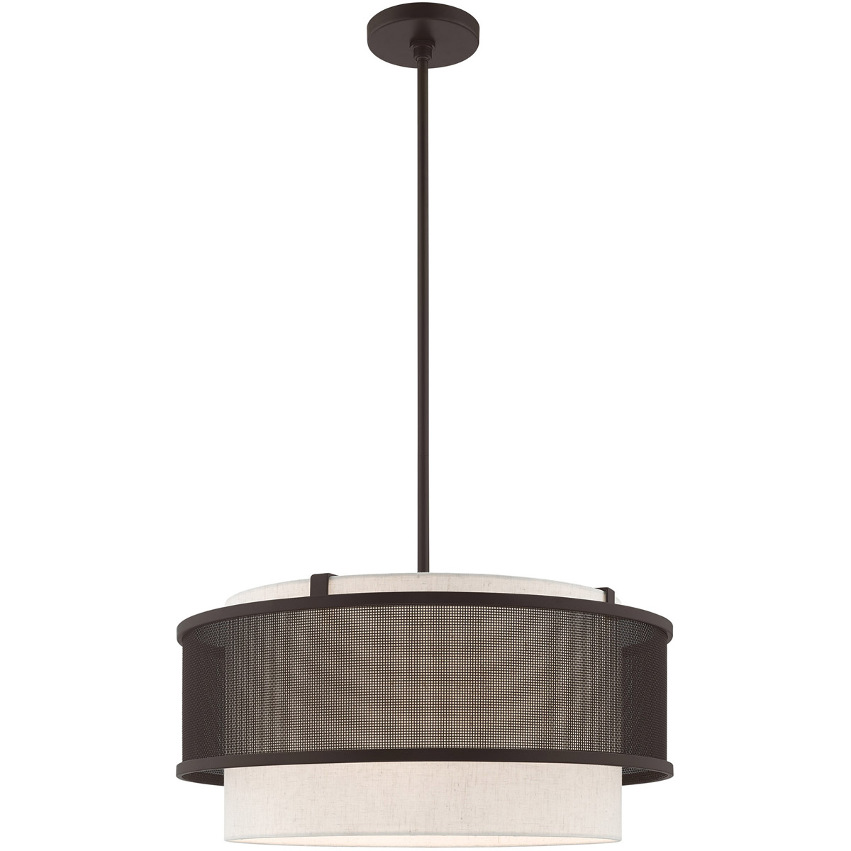 Elevate your modern living area with this urban bronze four light pendant chandelier featuring a hand crafted hardback oatmeal fabric shade cloaked in stainless steel mesh outer shade.