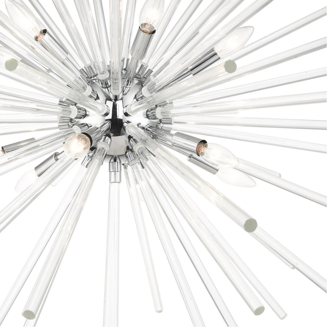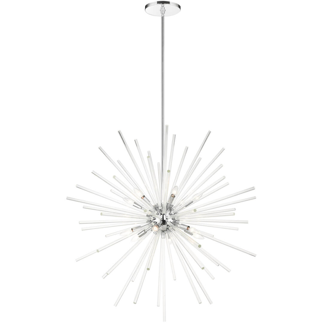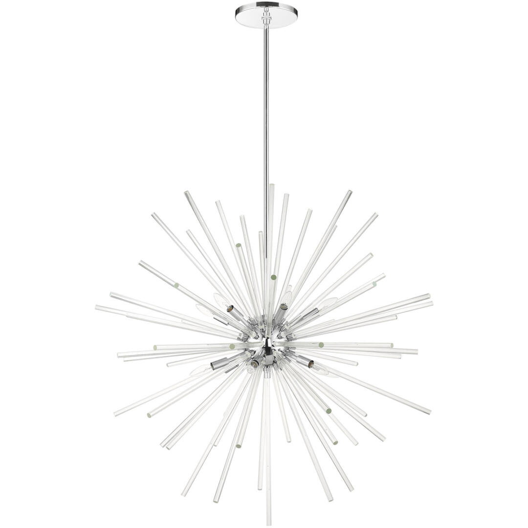 The Utopia twelve light foyer pendant chandelier will become an attention-grabbing feature in your modern home decor. The polished chrome finish graces the design with elegance and charm, providing a timeless and glamorous quality to any interior. The clear crystal rods give the pendant chandelier a sleek and attractive appearance.