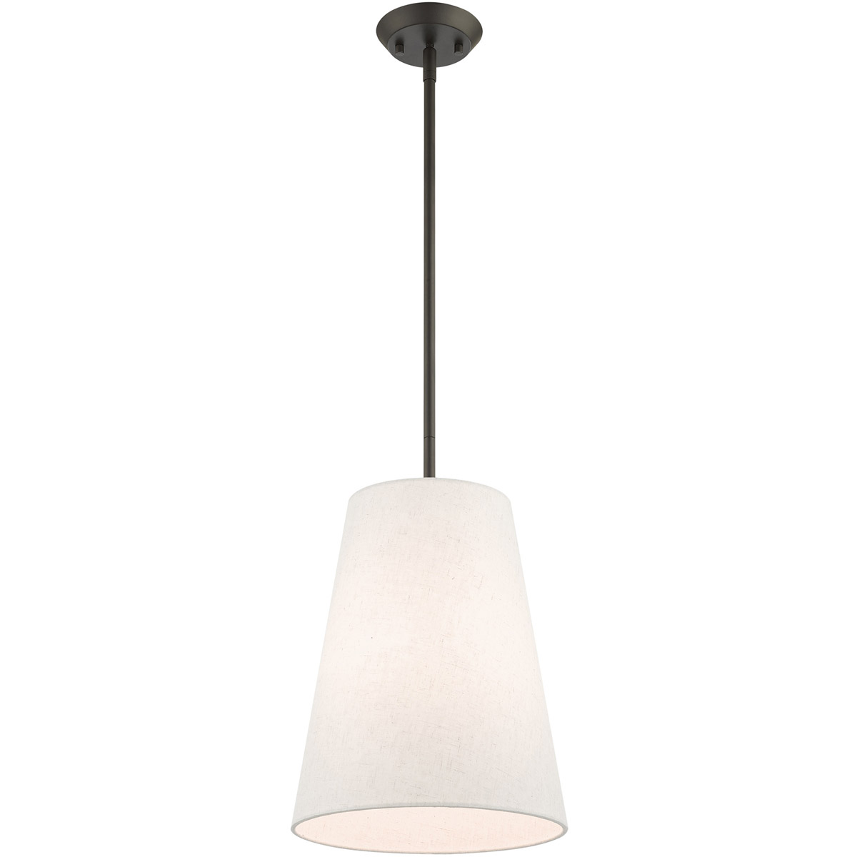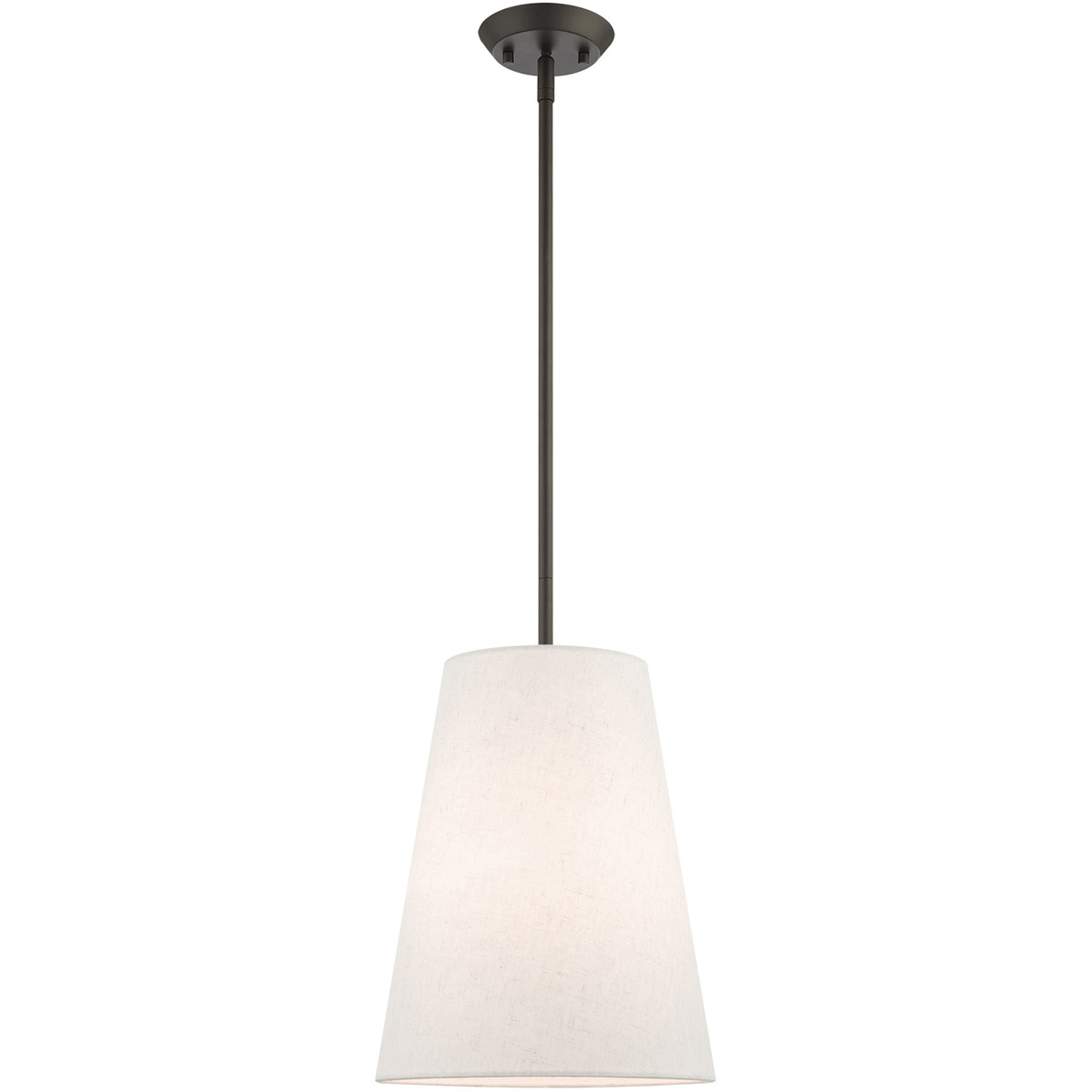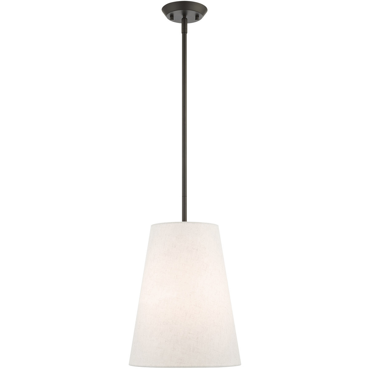 The Prato collection is both modern and versatile. The hand-crafted oatmeal colored fabric hardback shade sets a pleasant mood. The single light shade pendant adds character to this handsomely styled pendant. Perfect fit for the living room, dining room, kitchen and bedroom. This sleek design is shown in a bronze finish.