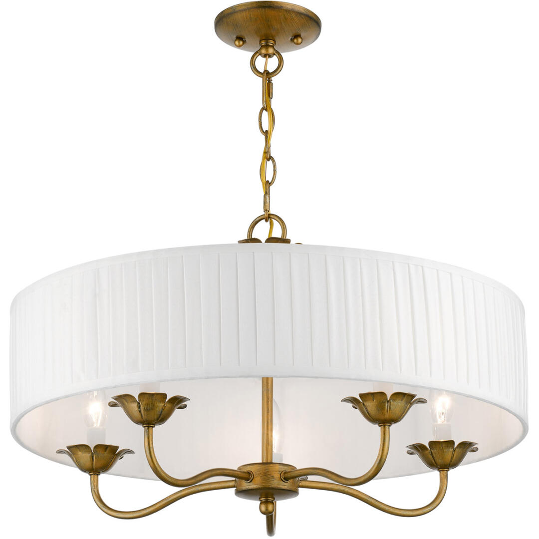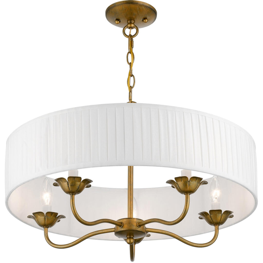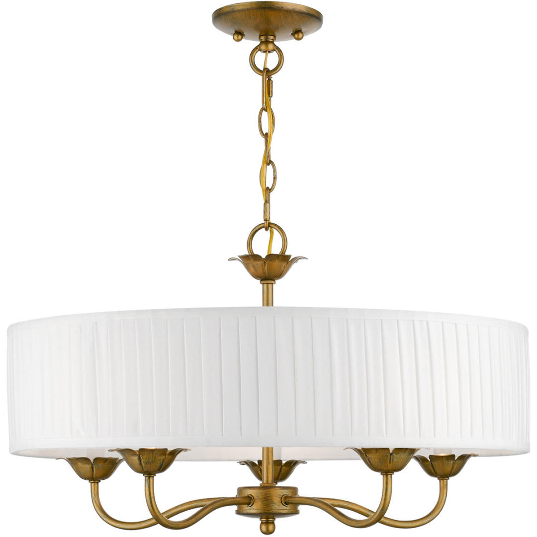 The five-light Edinburgh pendant chandelier combines floral details and casual elements to create an updated look. The hand-crafted off-white fabric hardback pleated drum shade is set off by an inner silky white fabric that combines with chandelier-like antique gold leaf finish sweeping arms which creates a versatile effect. Perfect fit for the living room, dining room, kitchen or bedroom.